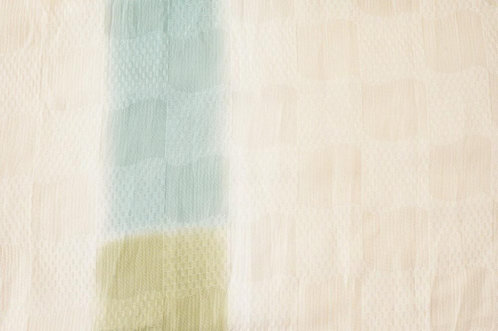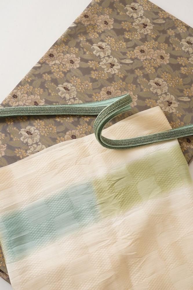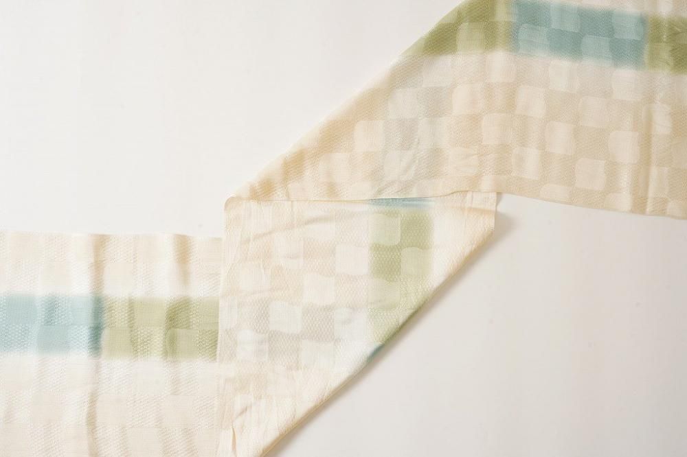 ■特記:市松地紋入りの薄卵色に、草色と浅葱色が染め暈されています