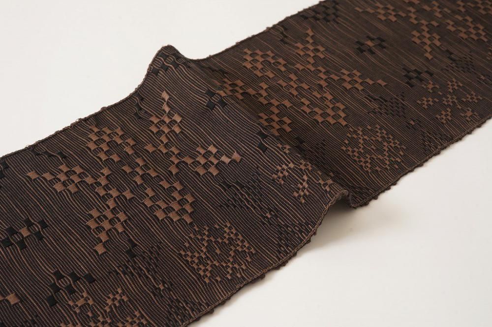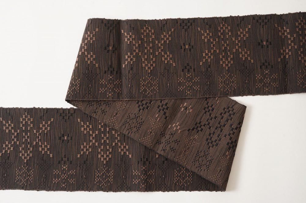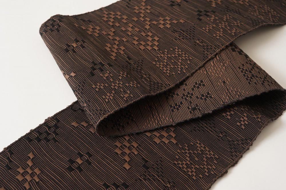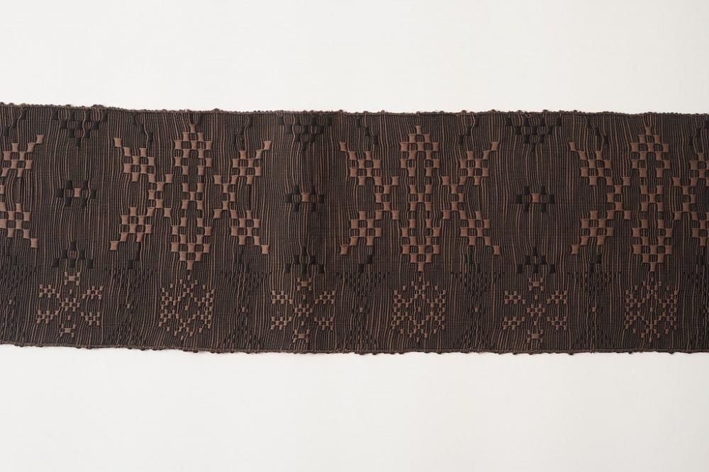 特徴の異なる3種類の綿糸を使い、ジャカード織りでしっかりと高密度に織り上げ、さらに洗いにかけることで素材の毛羽感や立体感をより感じられるようになった大人の半幅帯