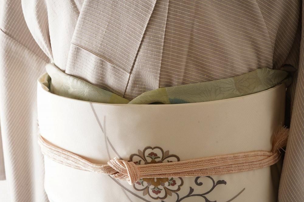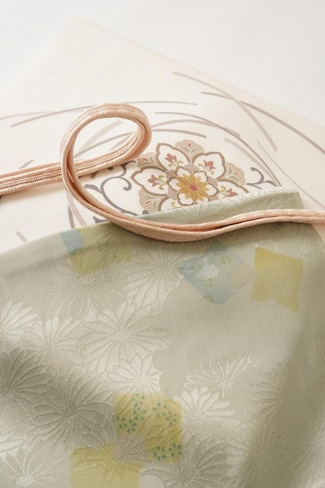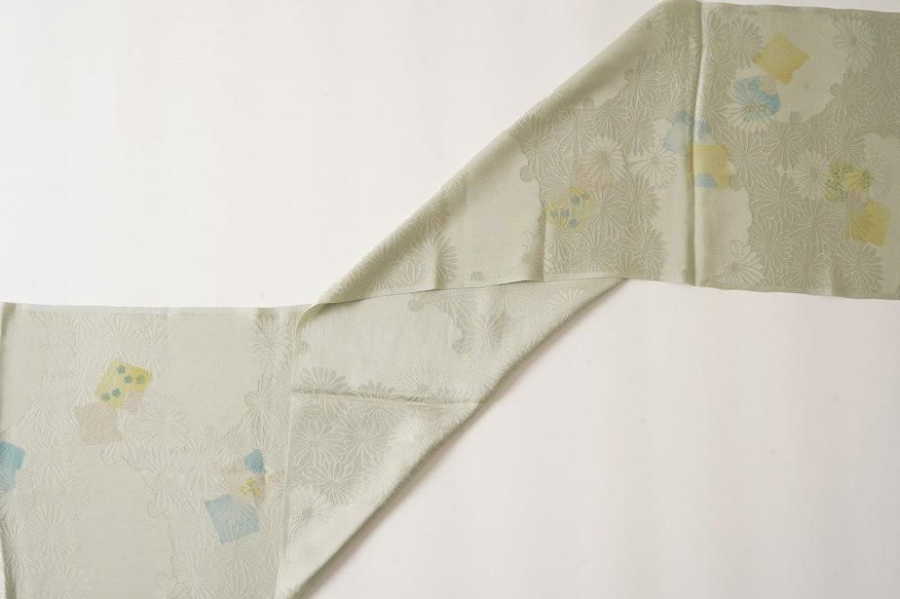 ■特記:地紋の入った柳色地に、銀彩入りの色紙文を散らした薄手の綸子地です