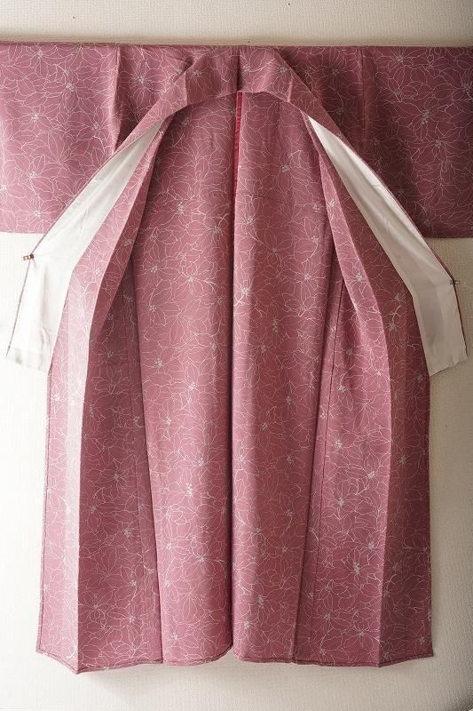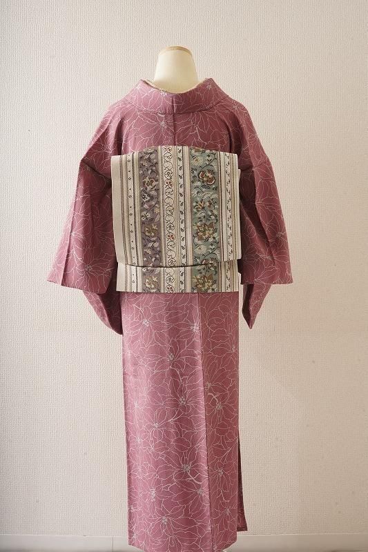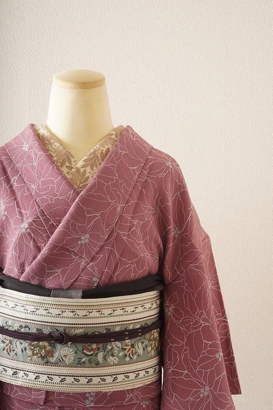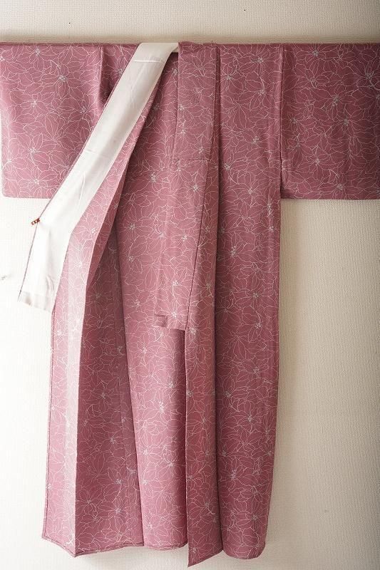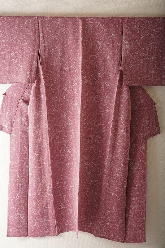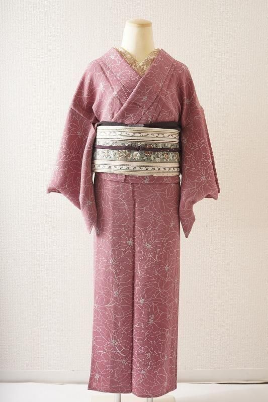 ■特記:くすみ系のピンクパープルは、和色大辞典より、あらぞめ(退紅)色が近いお色味。カサブランカが一面に咲き誇る、フェミニンな雰囲気の小紋です。