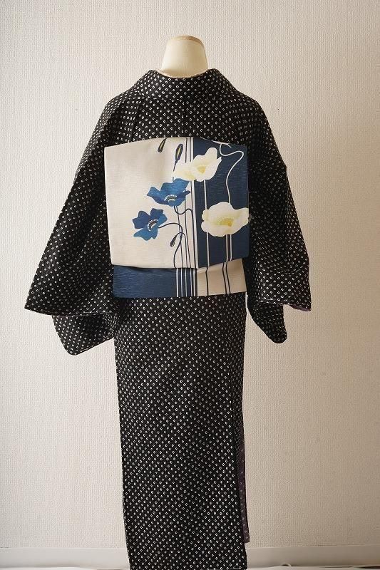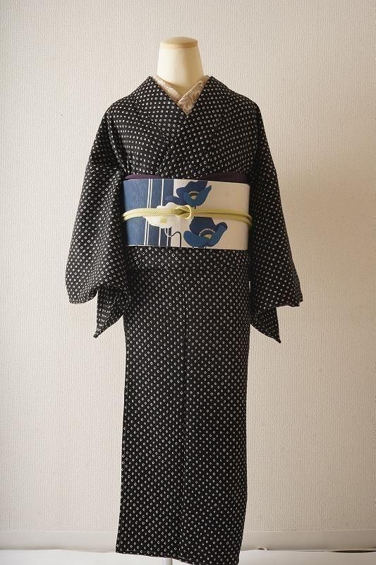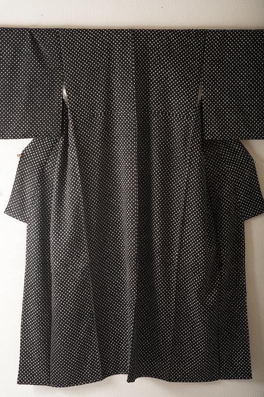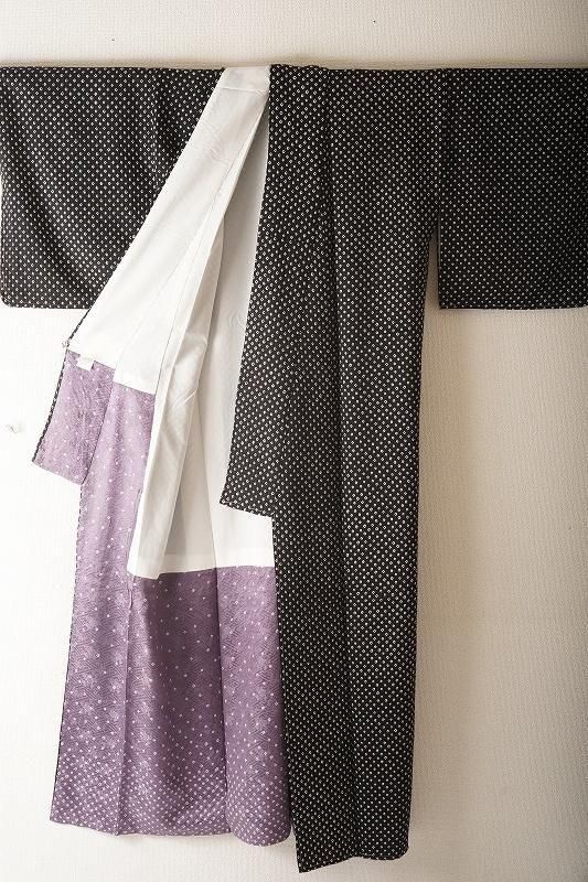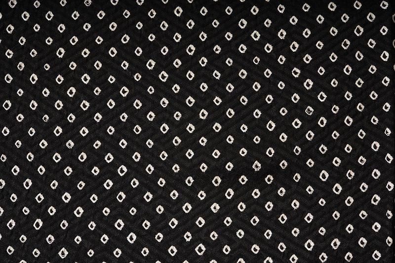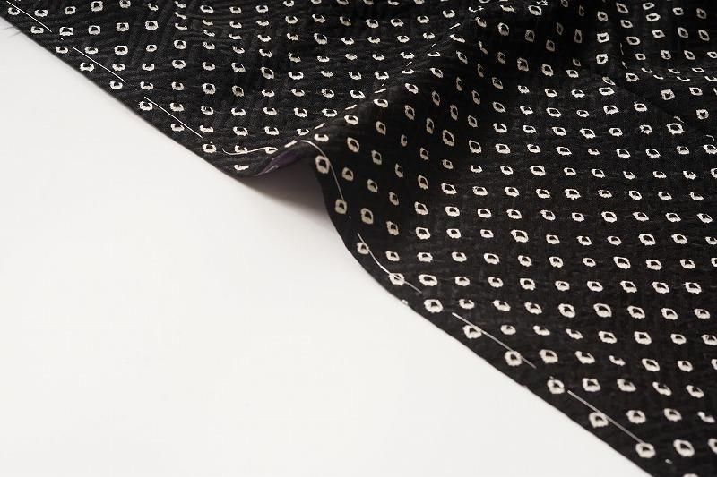 ■特記:紗綾形地紋入りの黒地に鹿の子絞りを施した小紋。八掛は菊と蘭を散らした紗綾形地紋の鹿の子絞り染めを施した鳩羽色が合わせられています。