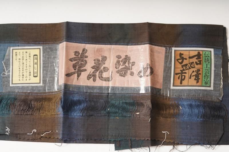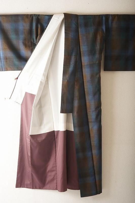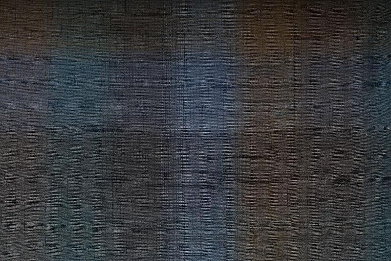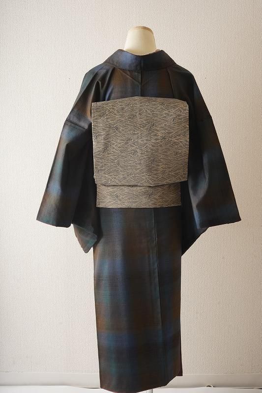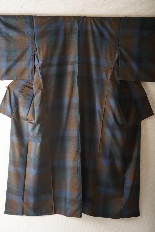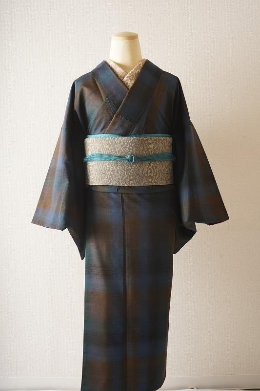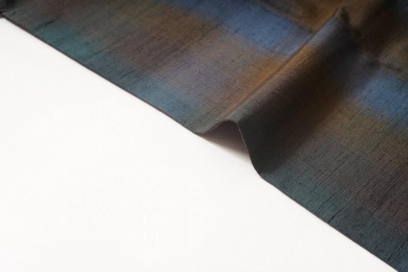 七代目吉澤与一の草木染めの紬。紺や黄茶色などの深みのある多色の色合いが格子状に層を成し、立体感を現します。