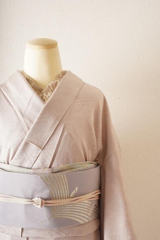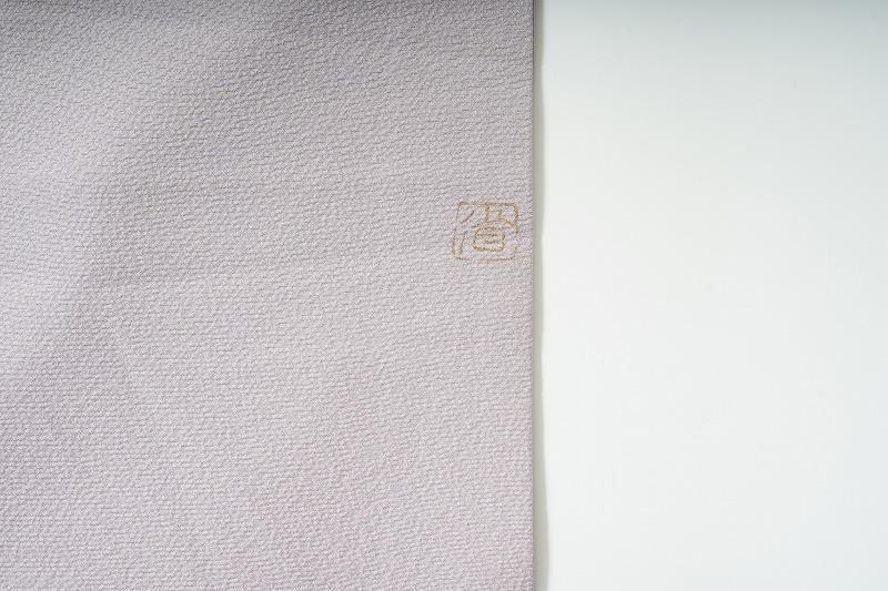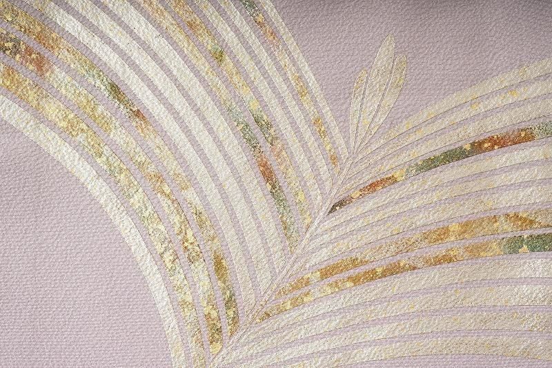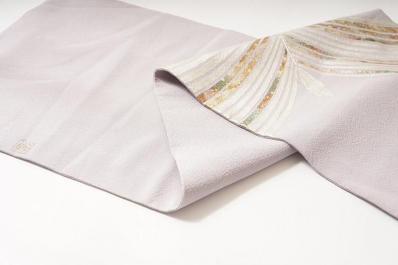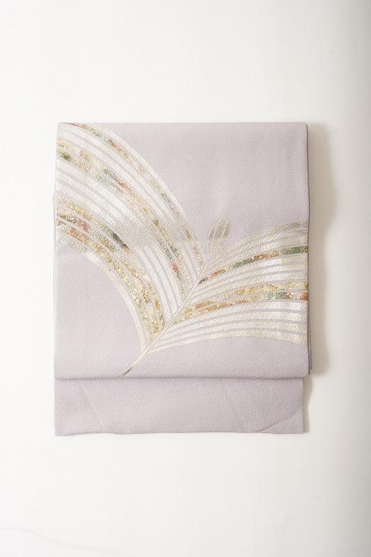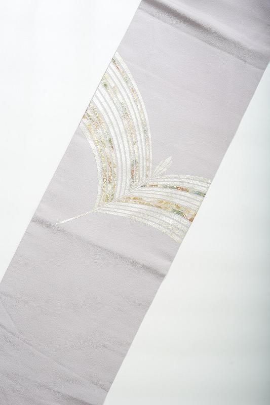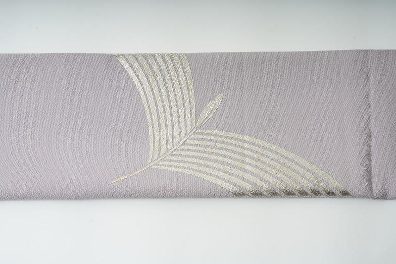 地のくすみ紫色は、和色大辞典より牡丹鼠色が近いお色味。やわらかな帯芯が使われた軽い質感です。金銀箔を用いて松文を現した、華やかな柄行きの長尺名古屋帯です。