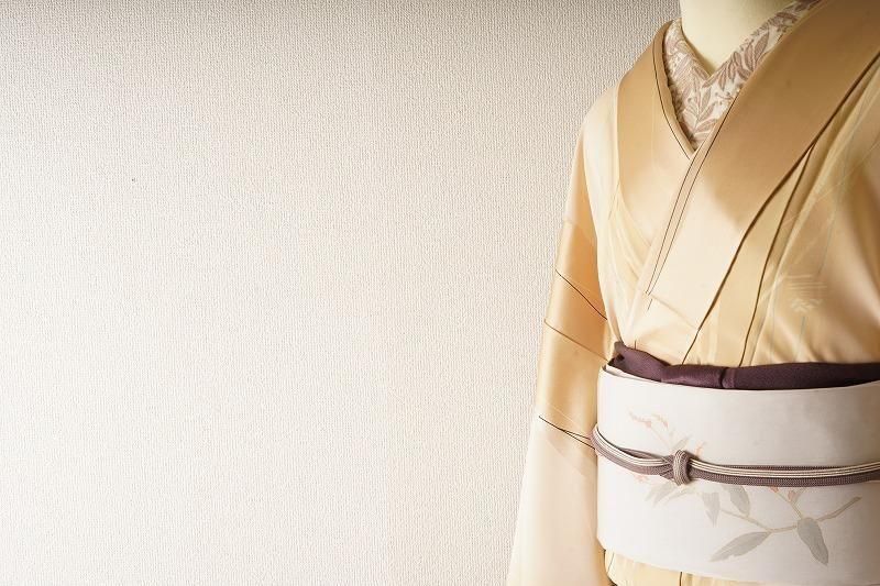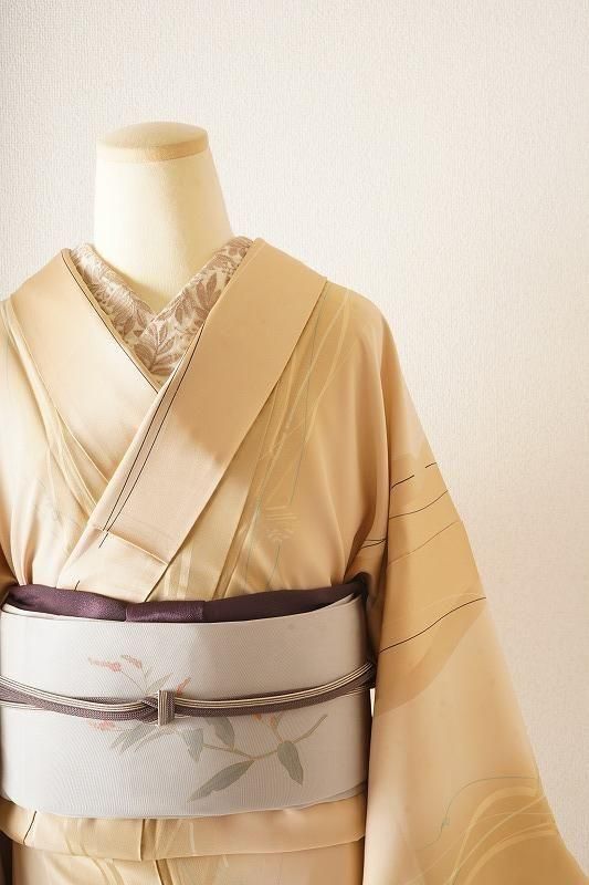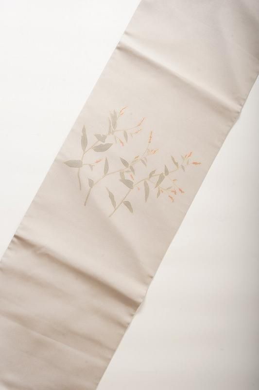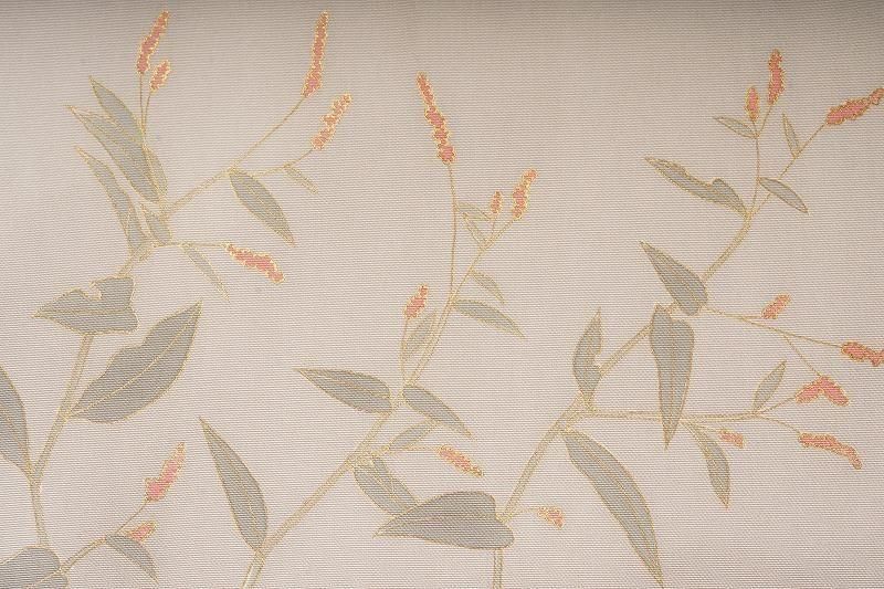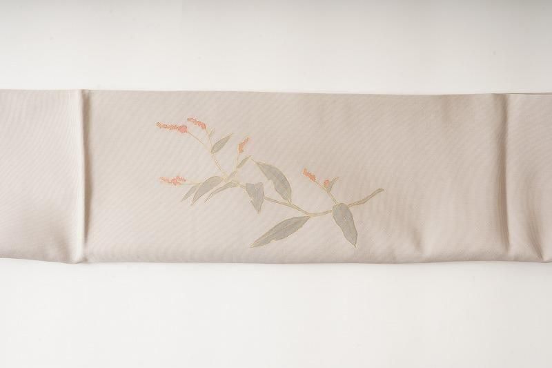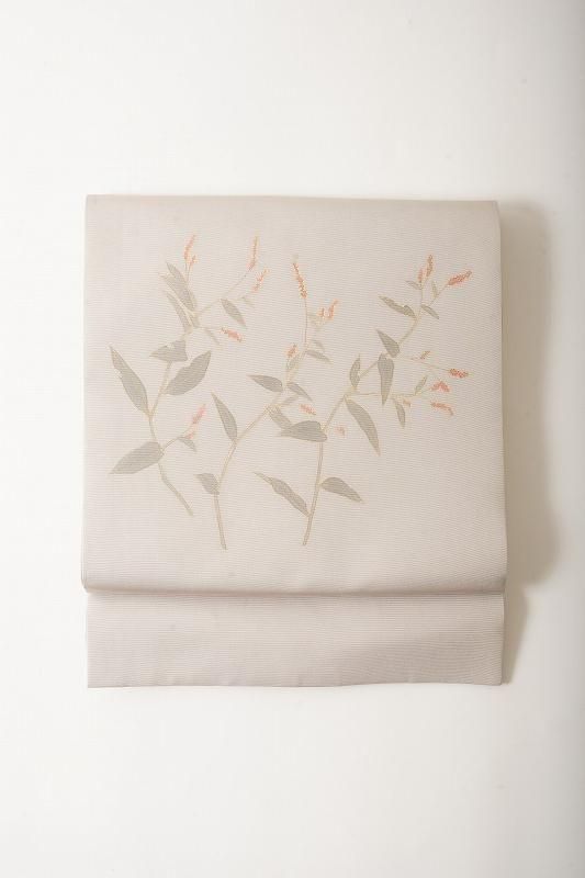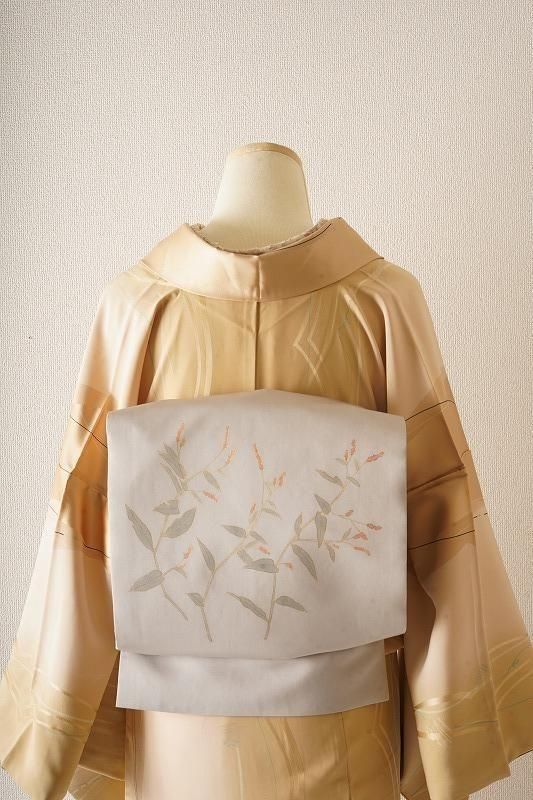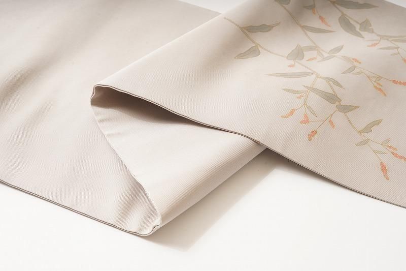 ■特記:塩瀬地の薄灰色は、和色大辞典より、薄鈍(うすにび)色が近いお色味。草花には金彩の縁取りが施され、儚げながらも凛とした印象を引き寄せます。