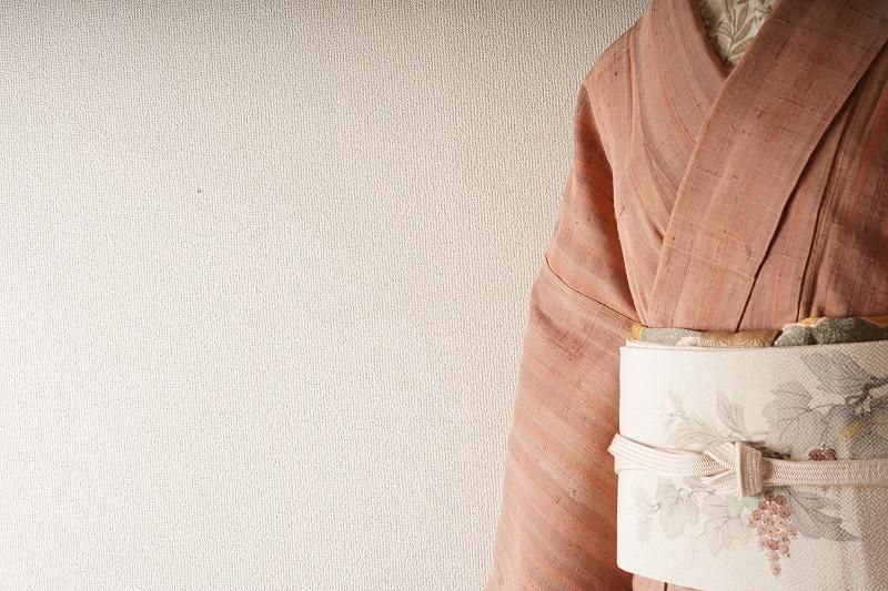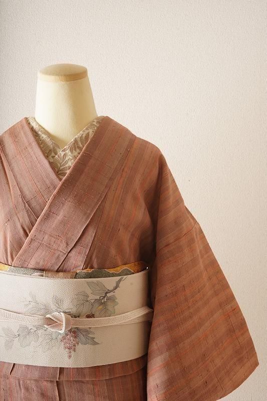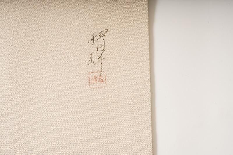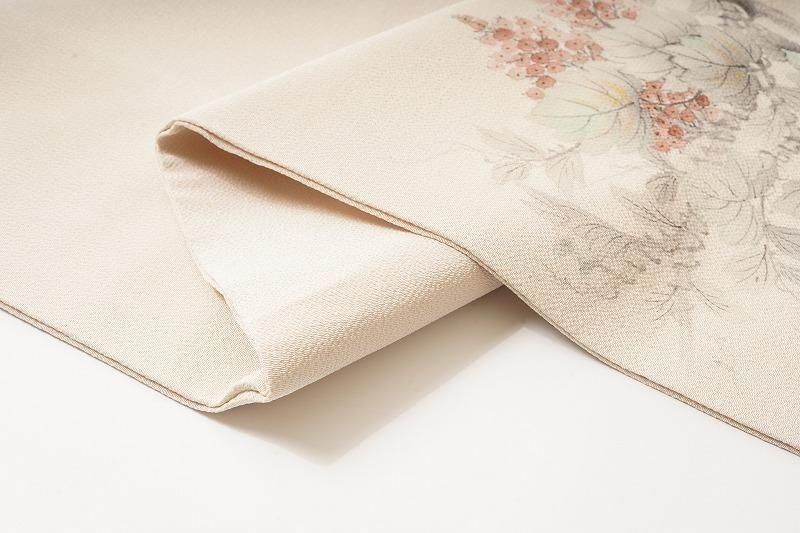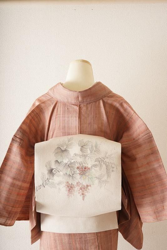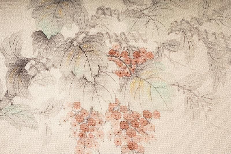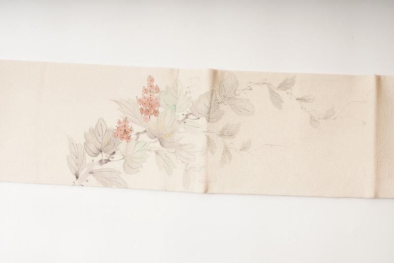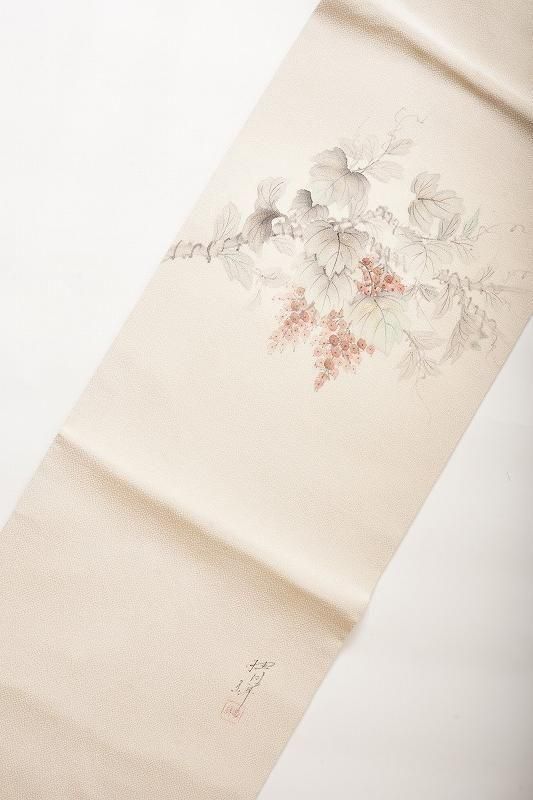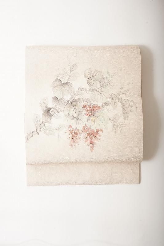 友禅作家、内山晴祥の名古屋帯。ほんのりとグレーに色づく白練色のちりめん地に、水彩画風に表現された葡萄が染め描かれています。金彩入り。