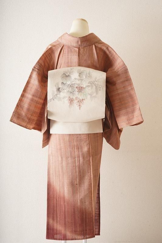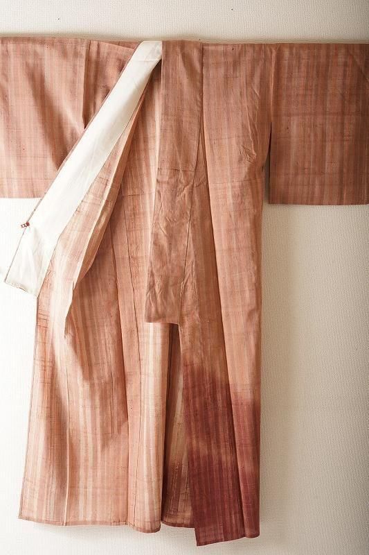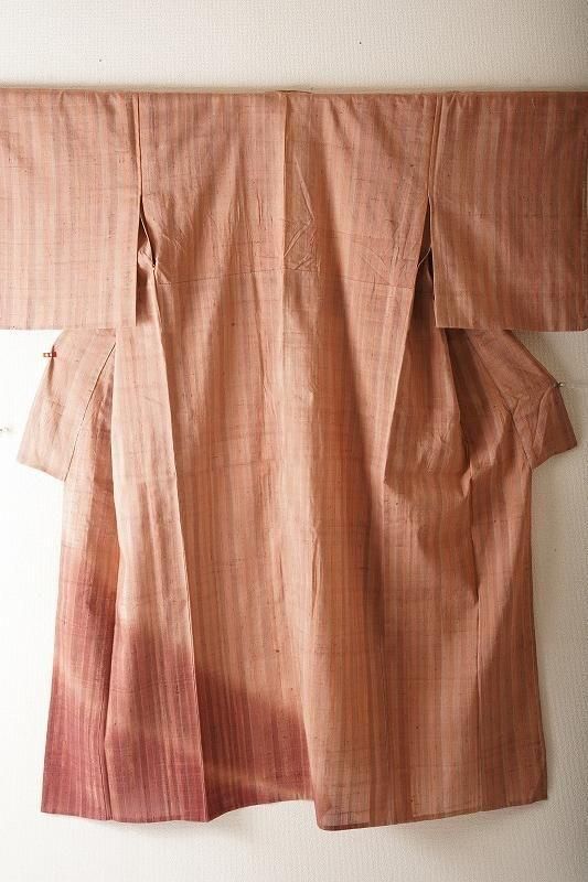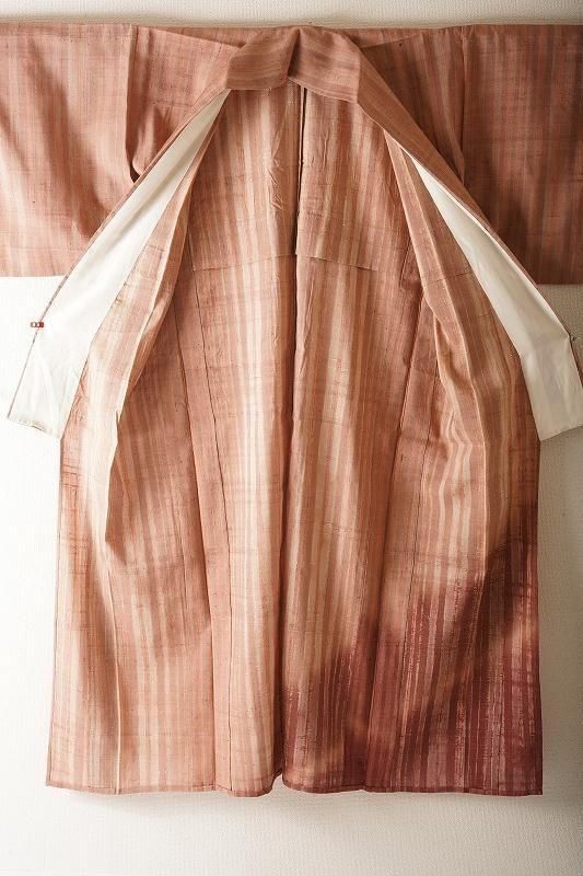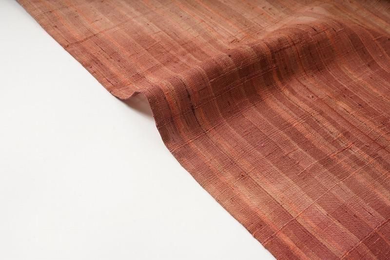 ■特記:遠州茶色を基調とした、くすみ系の赤茶で矢鱈縞を織り出した紬。裾暈しの赤褐色が粋な個性を生み出します。