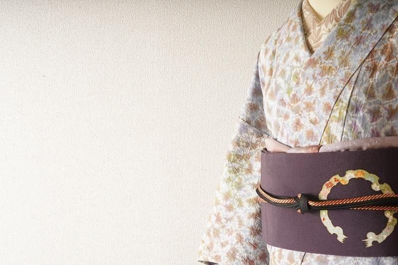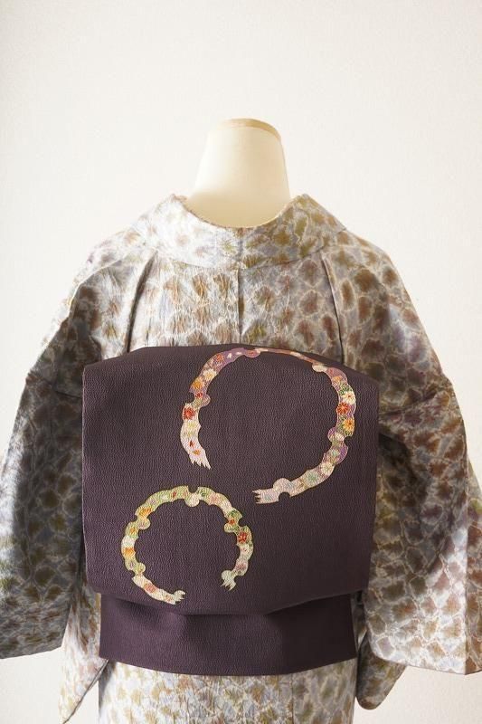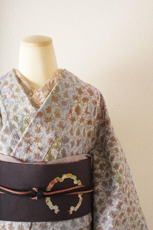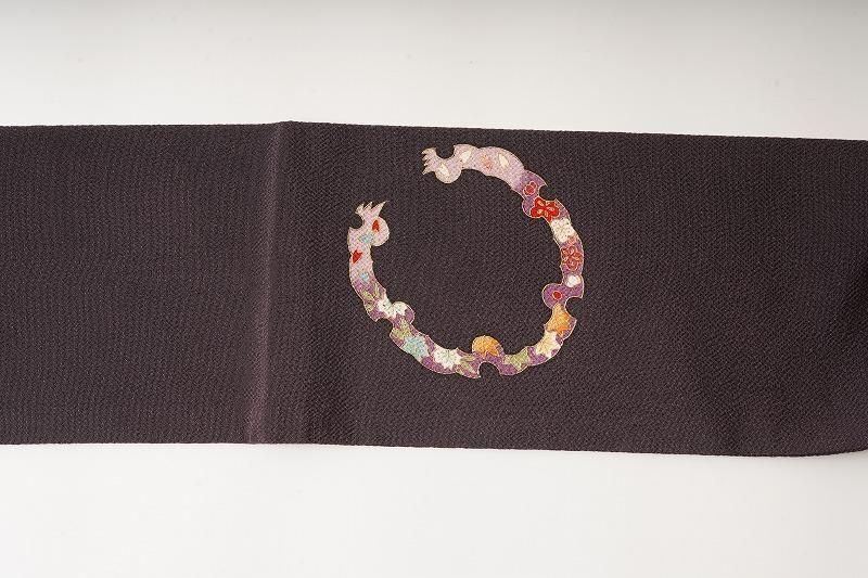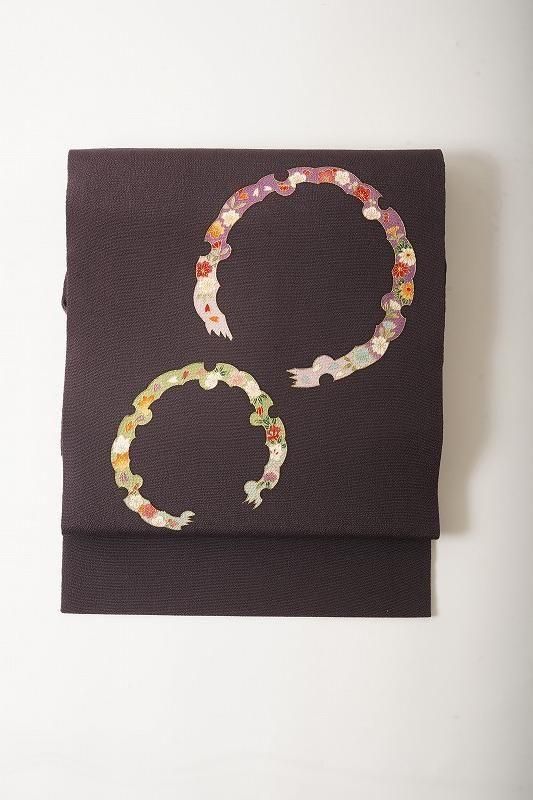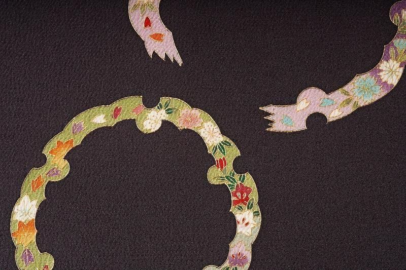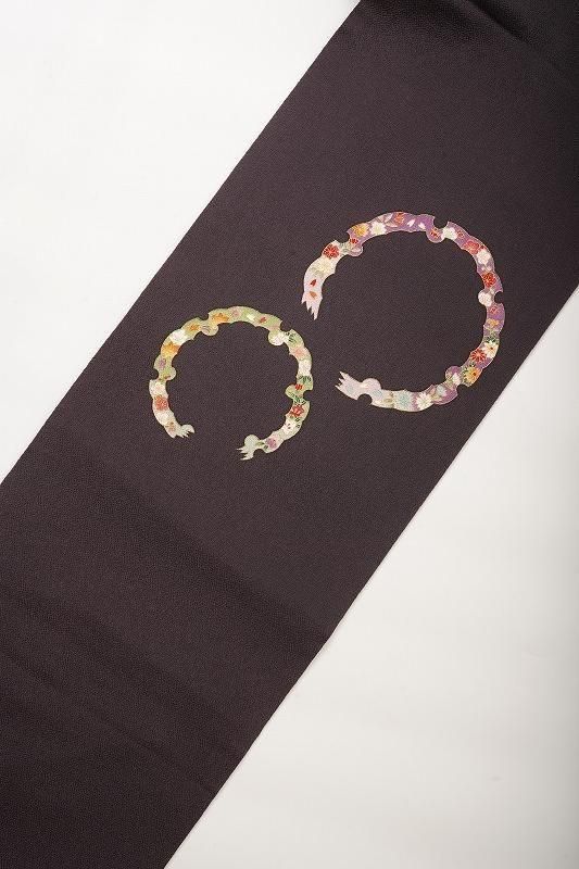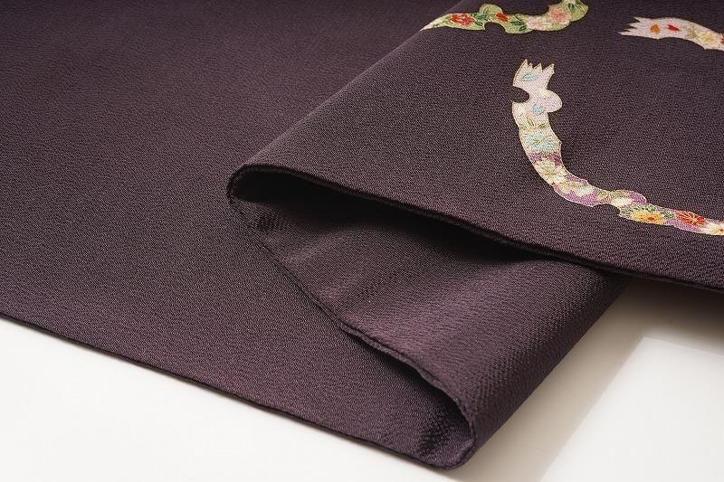 ■特記:濃紫色のちりめん地。雪輪を象った模様には、華やかな四季草花が金彩入りで丁寧に表現されています。