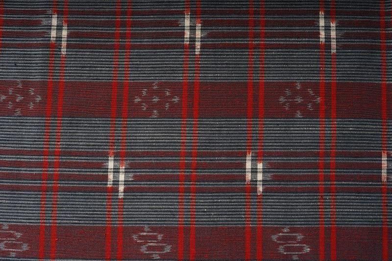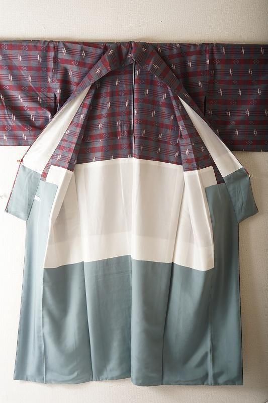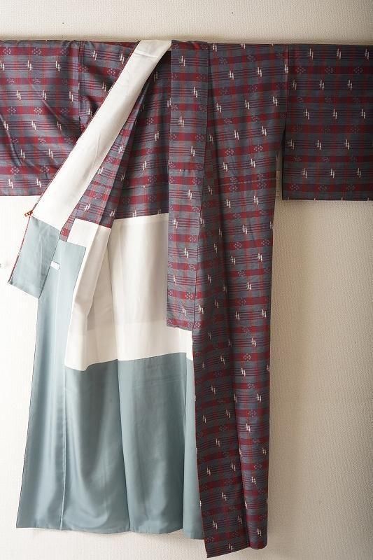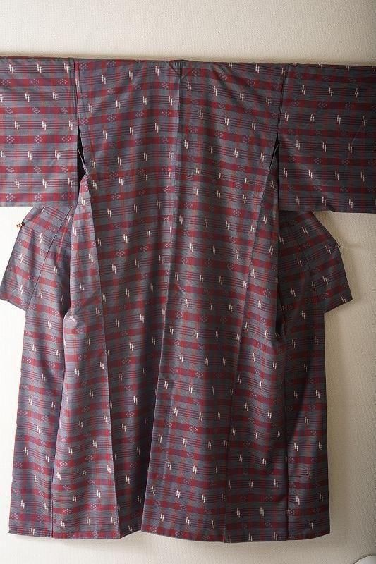 ■特記:BANKANの胴抜き仕立ての紬。えび色を基調としたあたたかみのある色に、紺にグレーの縞、絣の柄行きです。素朴ながらも華やかみのあるお色柄です。