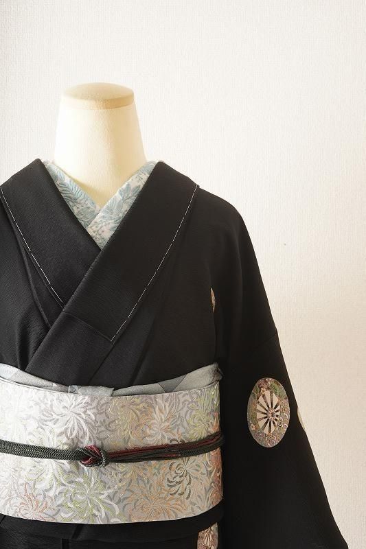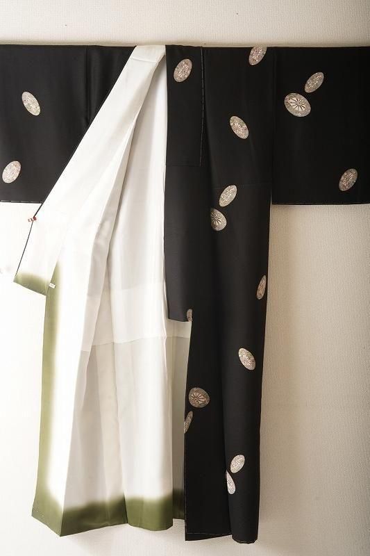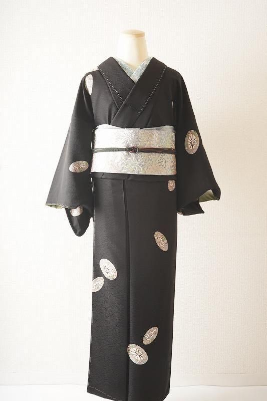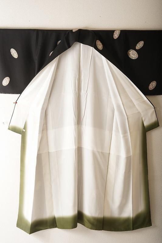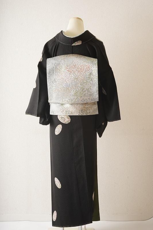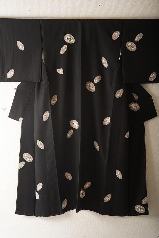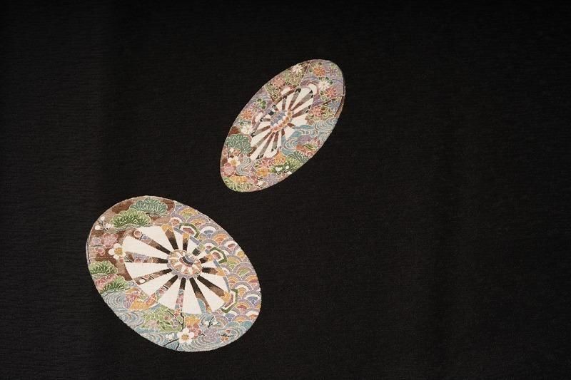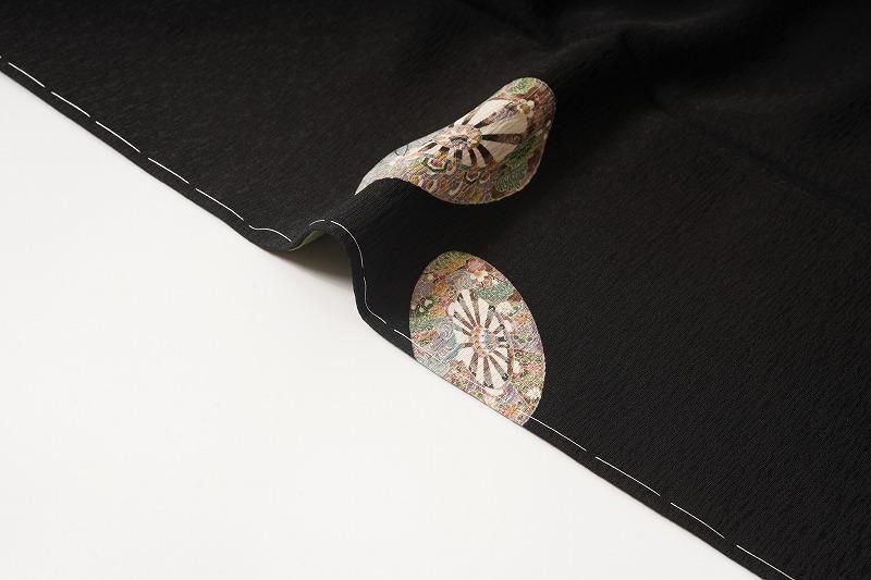 ■特記:細かい霞地紋が入った漆黒色地。細部まで丁寧に染め描かれた源氏車が散らされ、クラシックな気品を漂わせます。