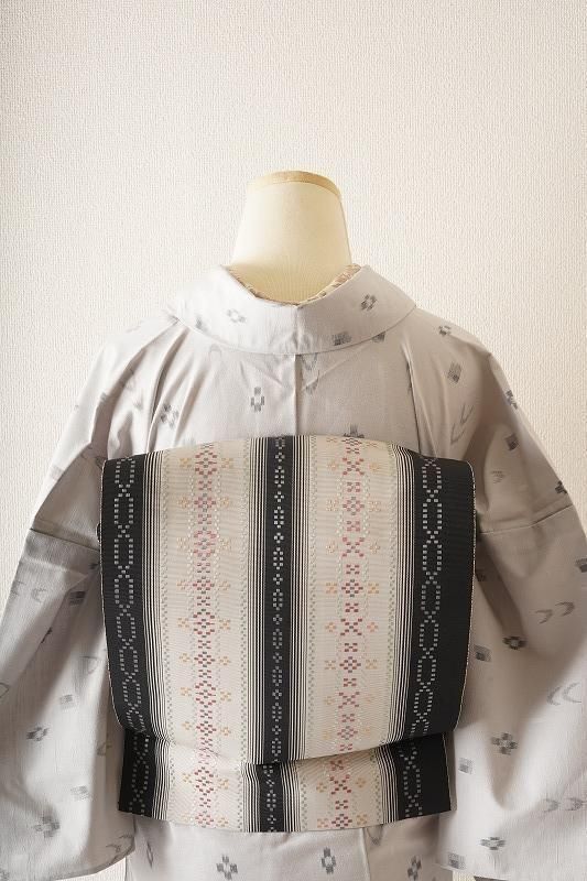 ■特記:洒落感のある、花織を施した博多織。無彩色の地に艶やかなピンクにベージュ、くすみブルーの色彩が柔らかに映える八寸名古屋帯です。