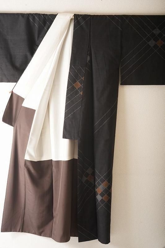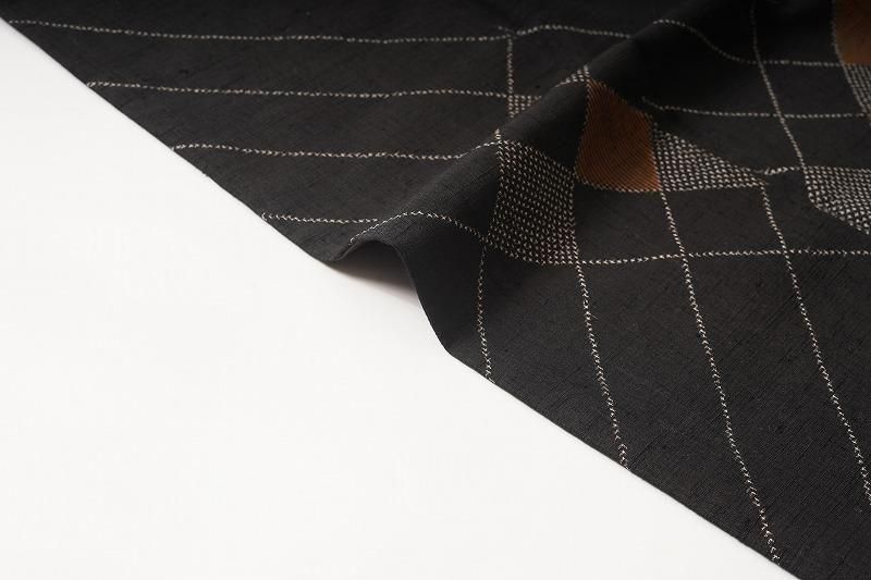 ■特記:黒地にブロックチェックのようなモダンな幾何学模様を付け下げ柄に織り出した紬。シャープな模様が洒落感を引き出します。秋色の小物を合わせて季節感を楽しんでみても。