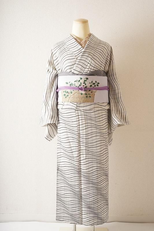水色のかすれた縞格子に、紺の濃淡で波のようなよろけ縞を染め上げた小紋。リズミカルな曲線が柔らかな清涼感を生み出します。