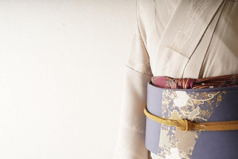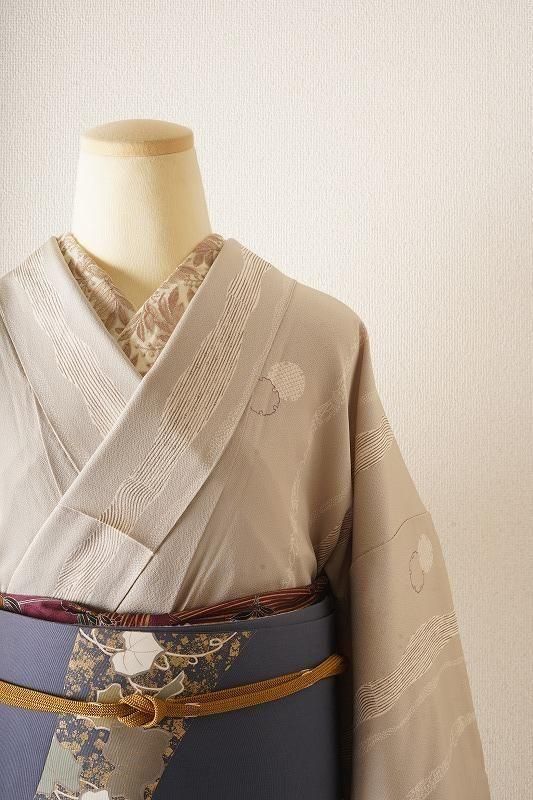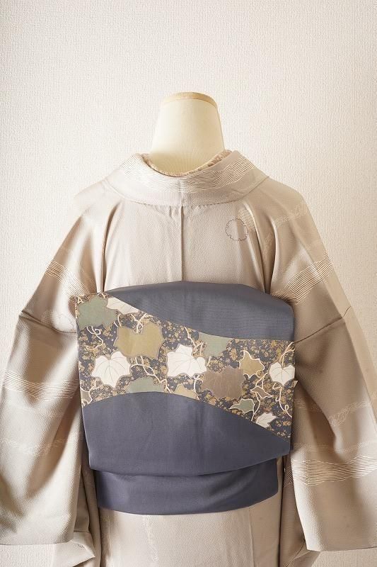 ■特記:金箔・金彩の加飾がされた蔦模様の名古屋帯。若干くすみのある青藍色が落ち着きのある空気を加え、凛とした装いに。
