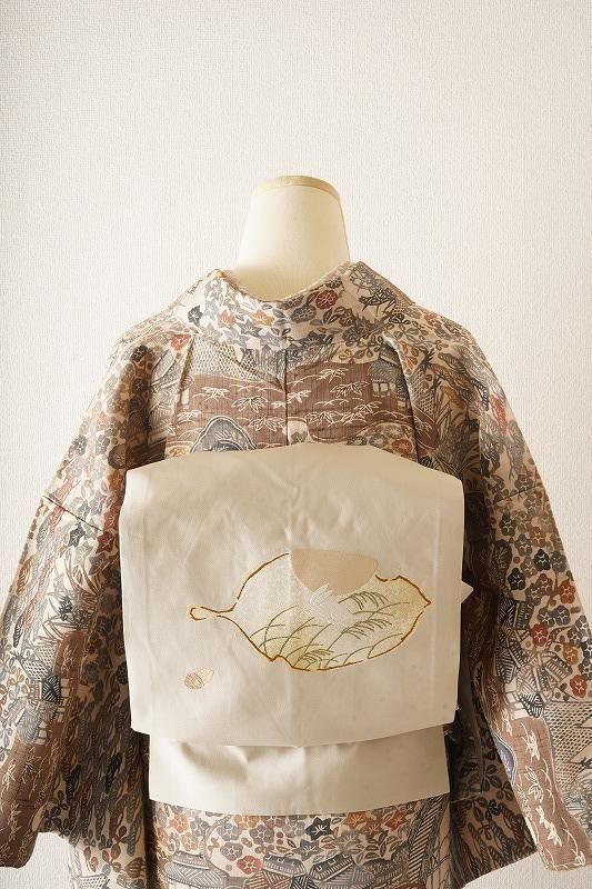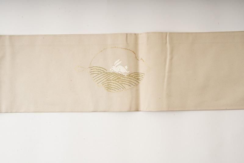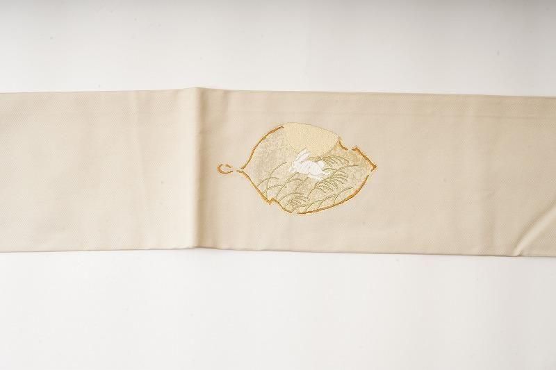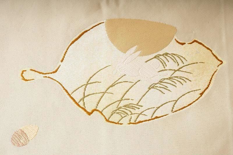 ■特記:艶感のある白橡色の織地。月夜に跳ねる兎を木の葉に現した、幻想的な風を運ぶ名古屋帯です。