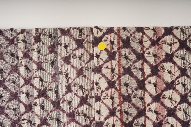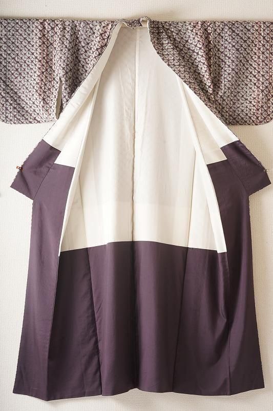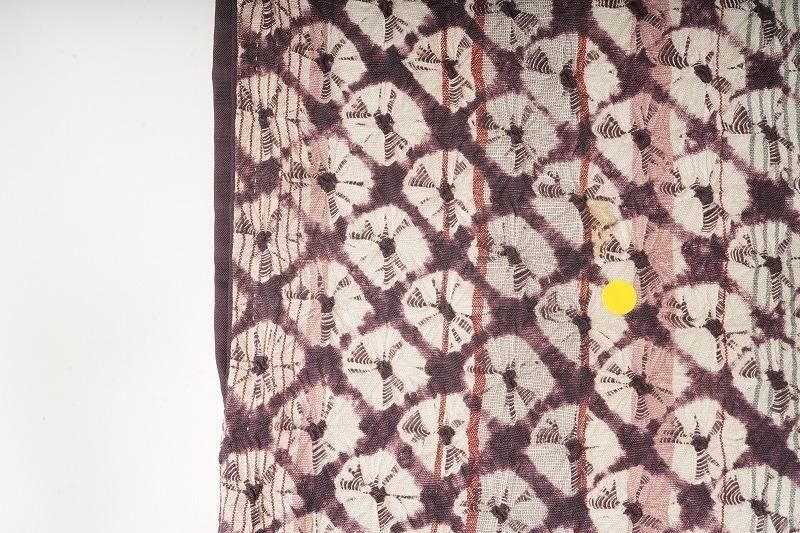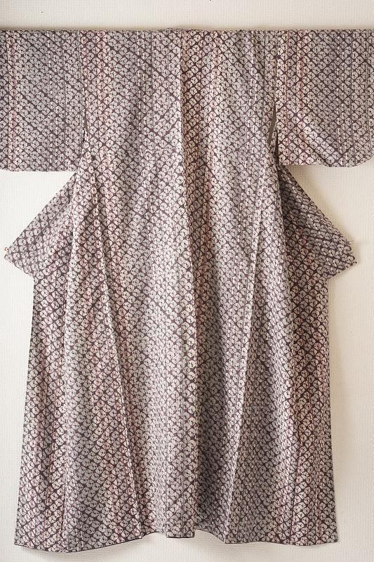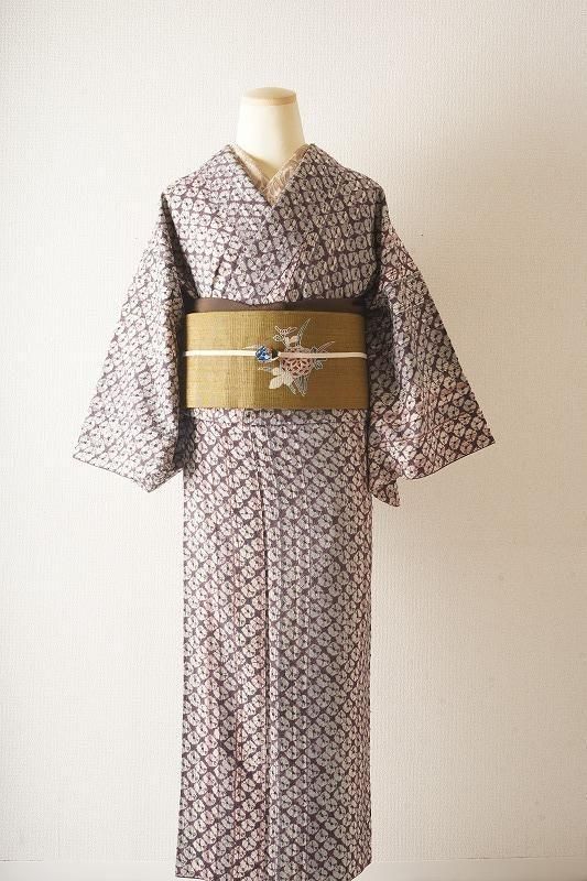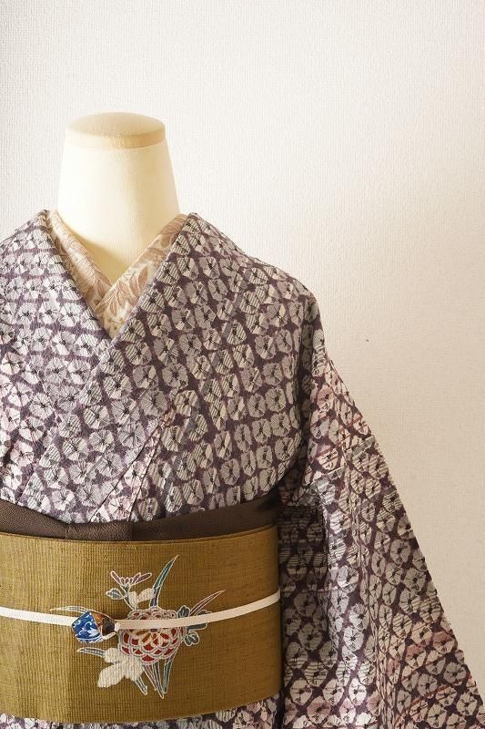 ■特記:縞を通した地に、滅紫色(和色大辞典参照)の蜘蛛絞りを施した小紋。色柄ともにフェミニンな印象を運びます。