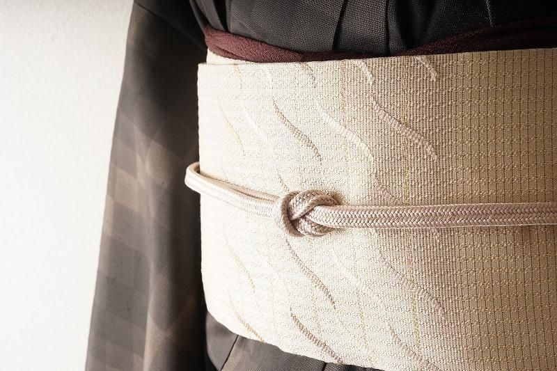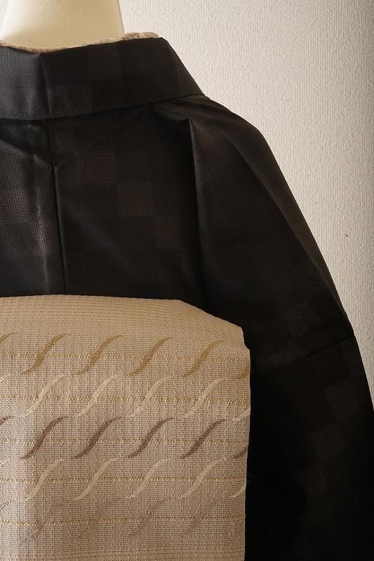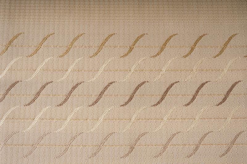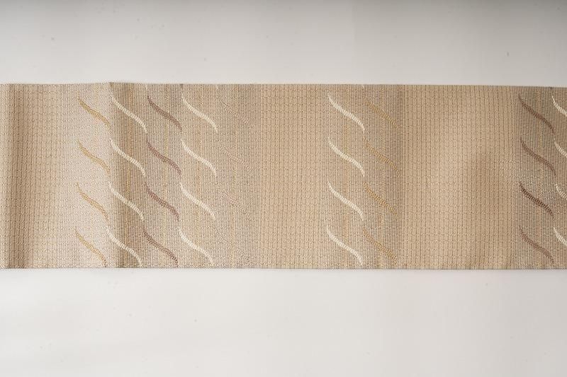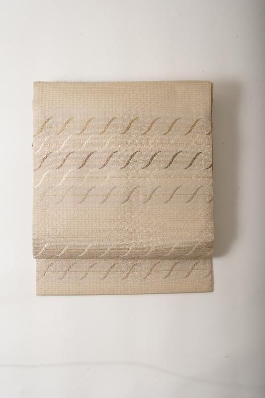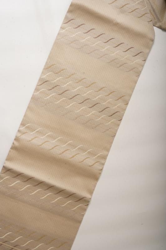■特記:グレージュトーンの色味は、和色大辞典では白橡色、亜麻色が近いです。三色で表した揺らいだ曲線が、立体感をみせながら、爽やかでおおらかなイメージを運びます。