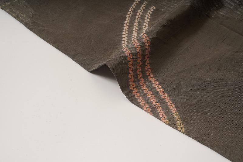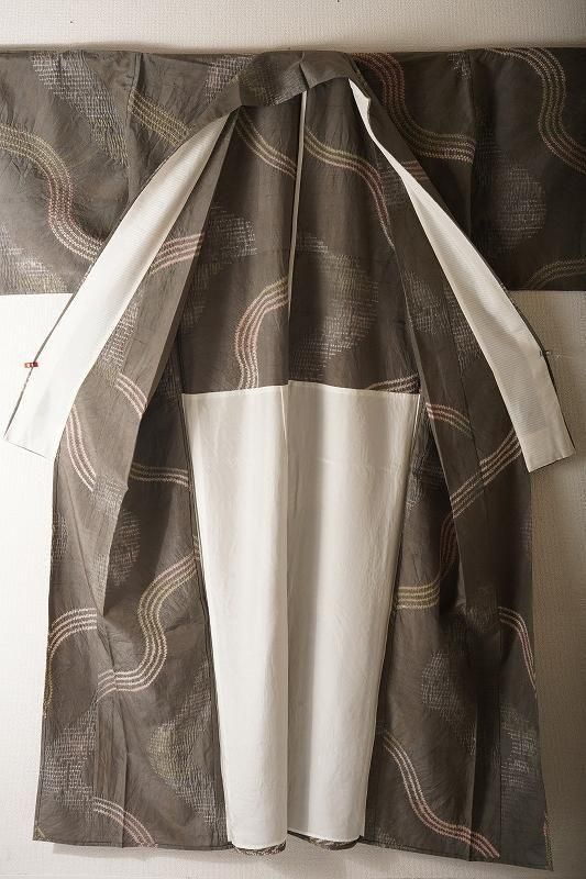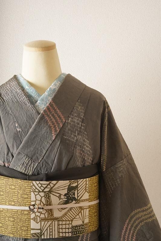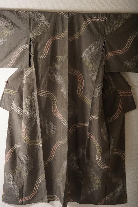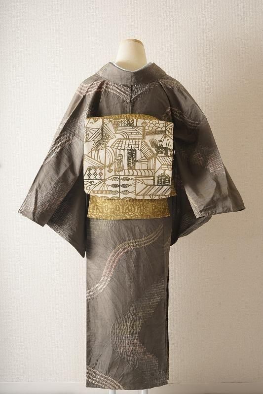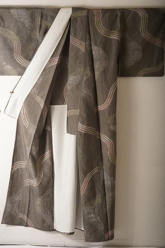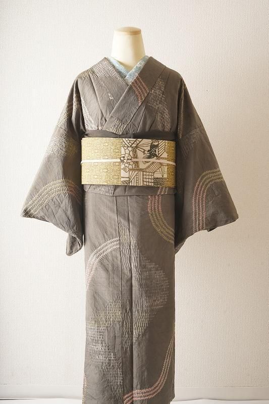 煤色の粋な地色に、ゆるりとした曲線を絞り染めで染めあしらった小紋。くすみカラーの流線が現代風の着姿を引き寄せます。
