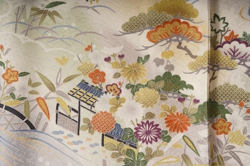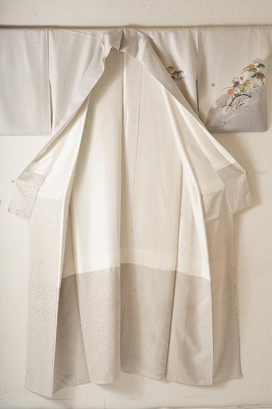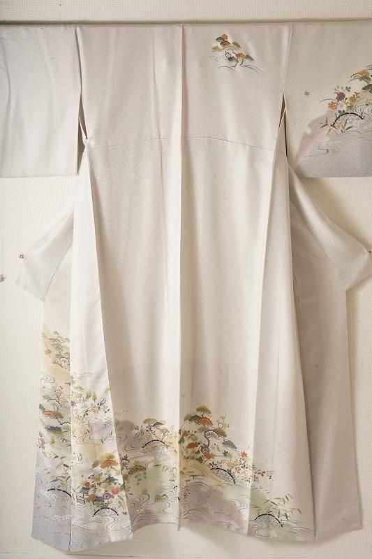 ■特記:地模様入りの白鼠色は、光の加減でシルバー風に輝く上品なお色味です。随所に金彩や染め疋田を丁寧に施し、豊かな自然の風景が広がります。