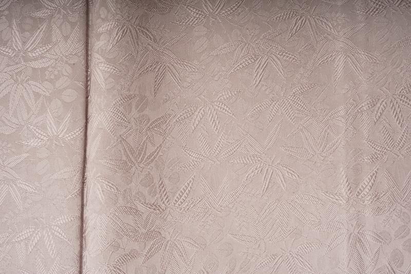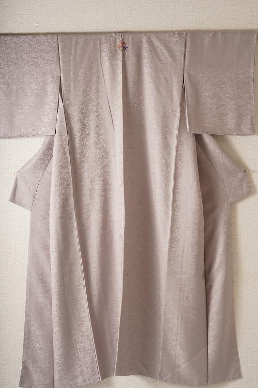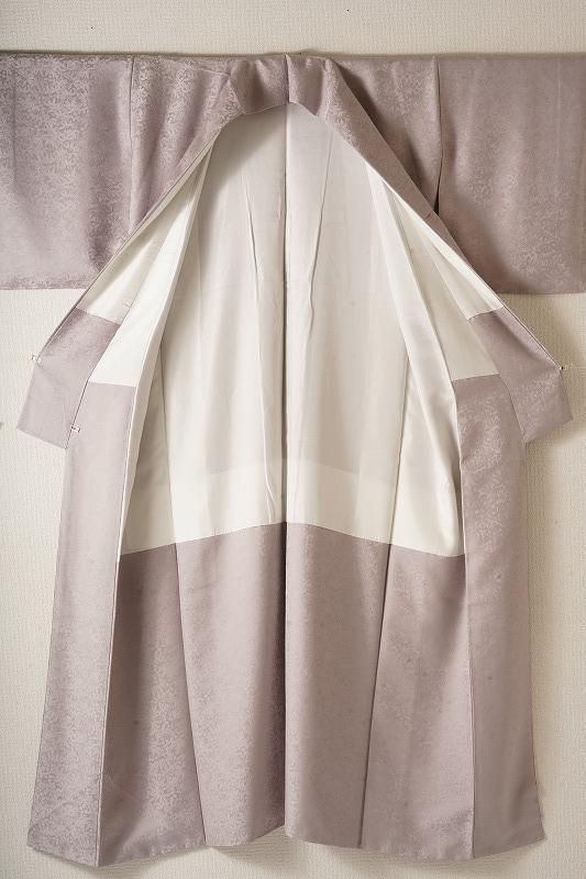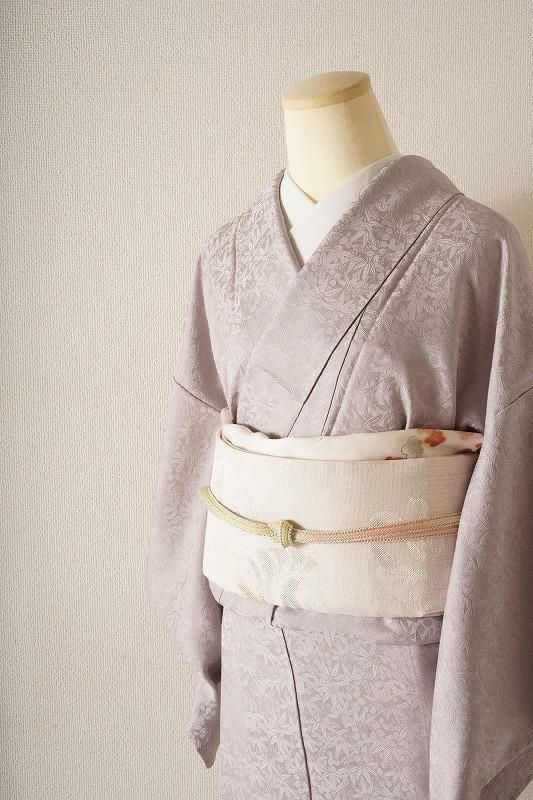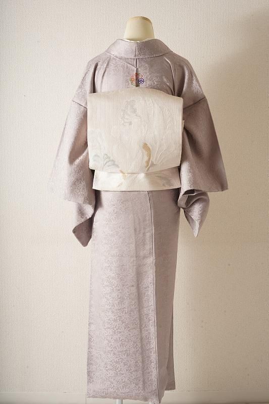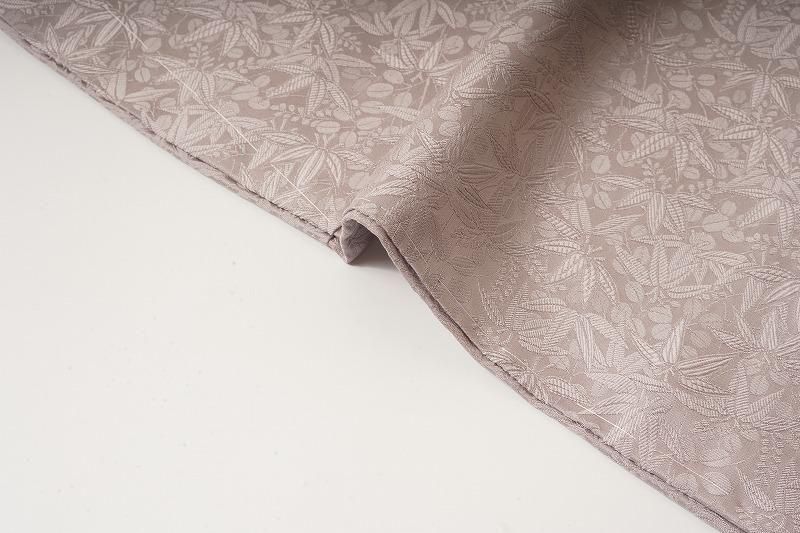 ■特記:背に洒落文あり。色味は和色大辞典の、牡丹鼠色を若干深くしたくすみ紫色です。笹と萩の地模様が立体的な質感を引き出します。