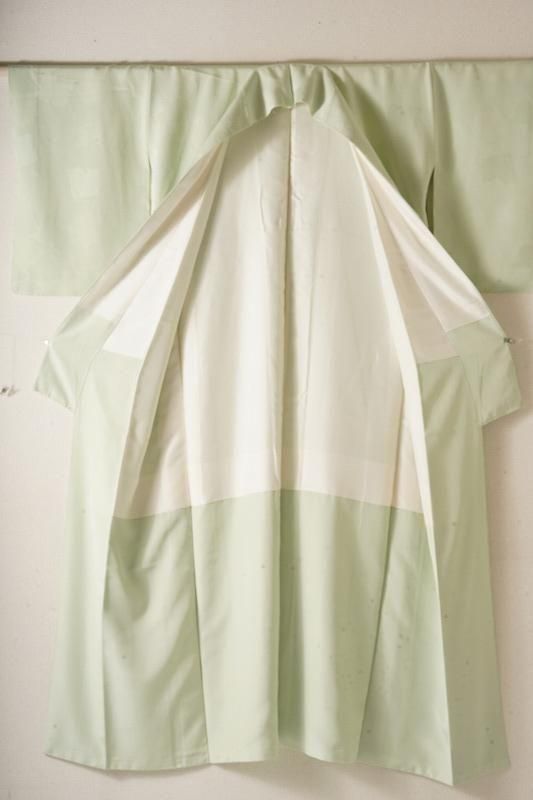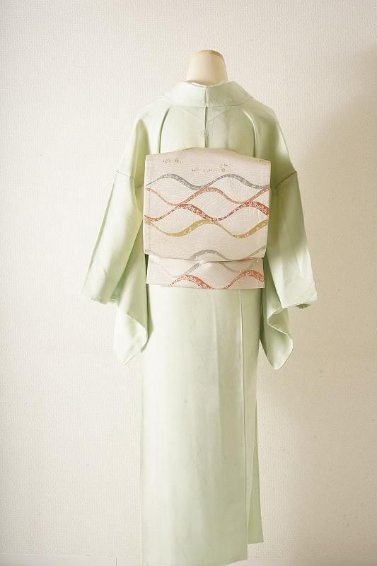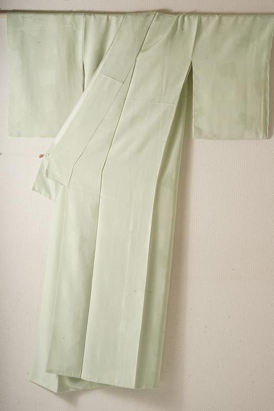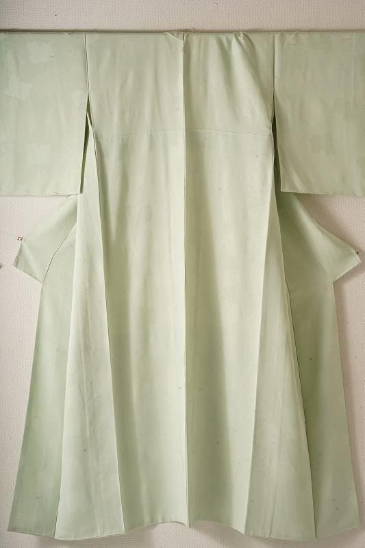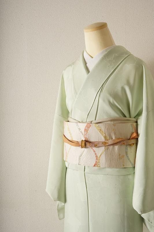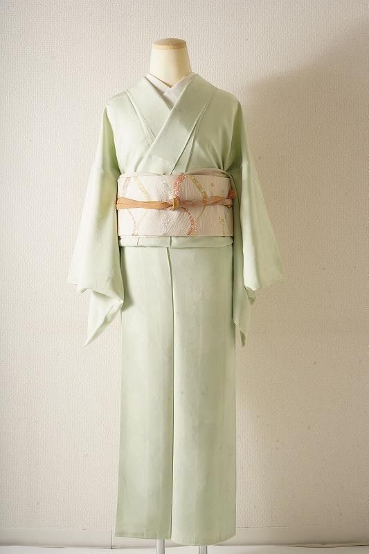 より、薄萌葱色が近いお色味です。大きめの切継ぎ模様を尽くした地模様が、光の増減で華やかに浮かび上がり、着姿に明るさを加えます。