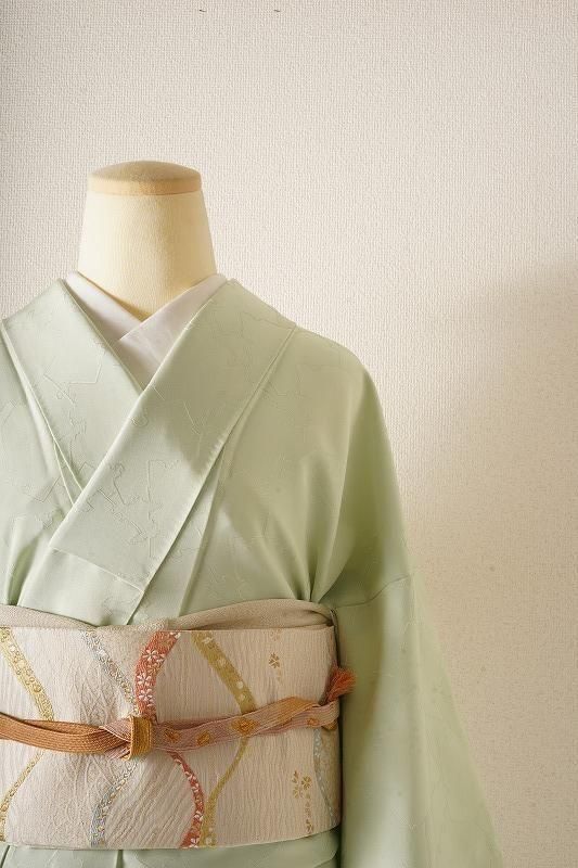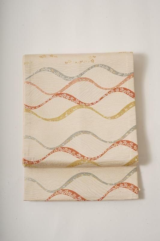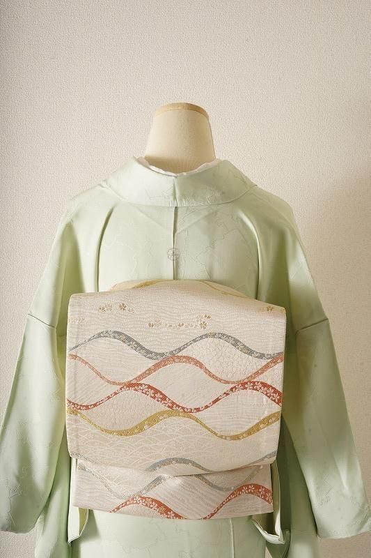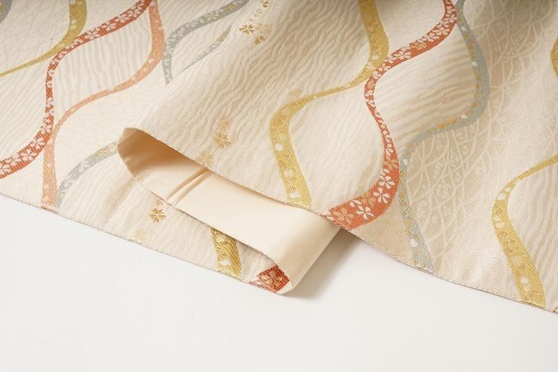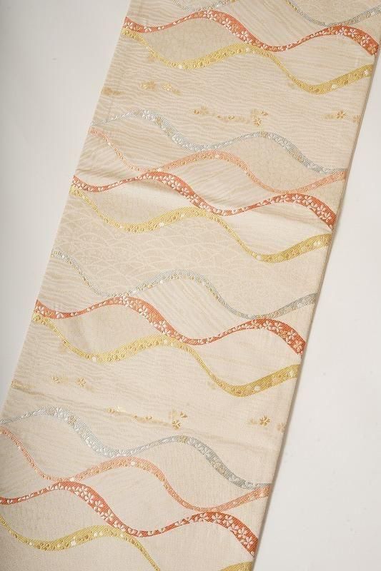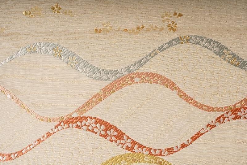 ■特記:艶感のあるパールベージュ地。豊かな風景を想起する地模様を配し、唐織や金糸で波模様を織り表しています。