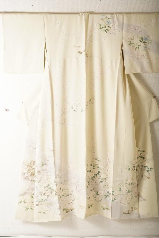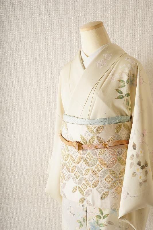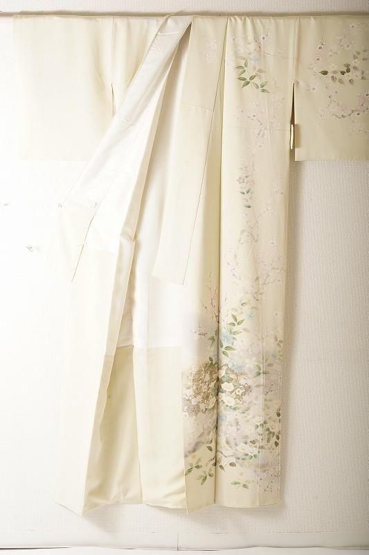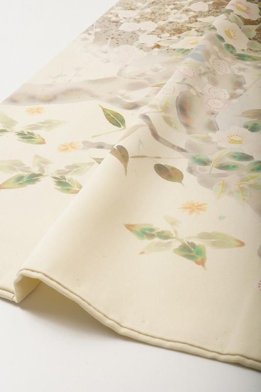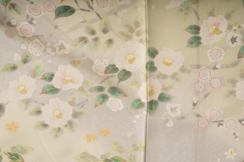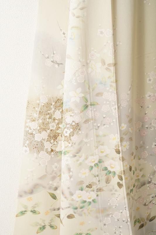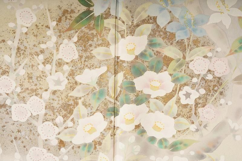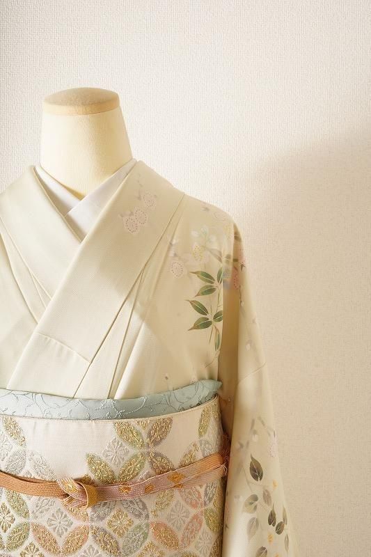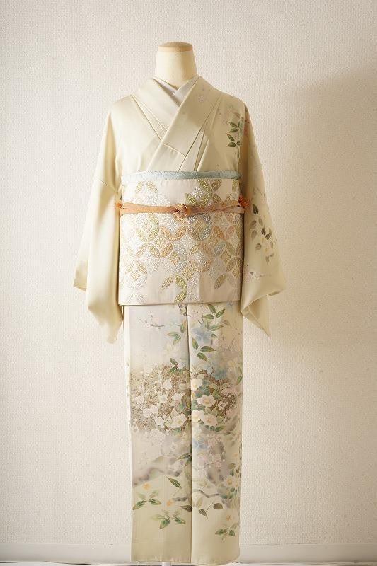 明るい黄緑色の若芽色(和色大辞典参照)に、四季草花をあでやかに染め抜いた訪問着。前柄には金銀彩のたたき染めも施されています。