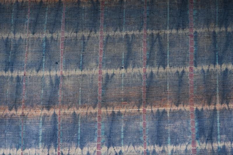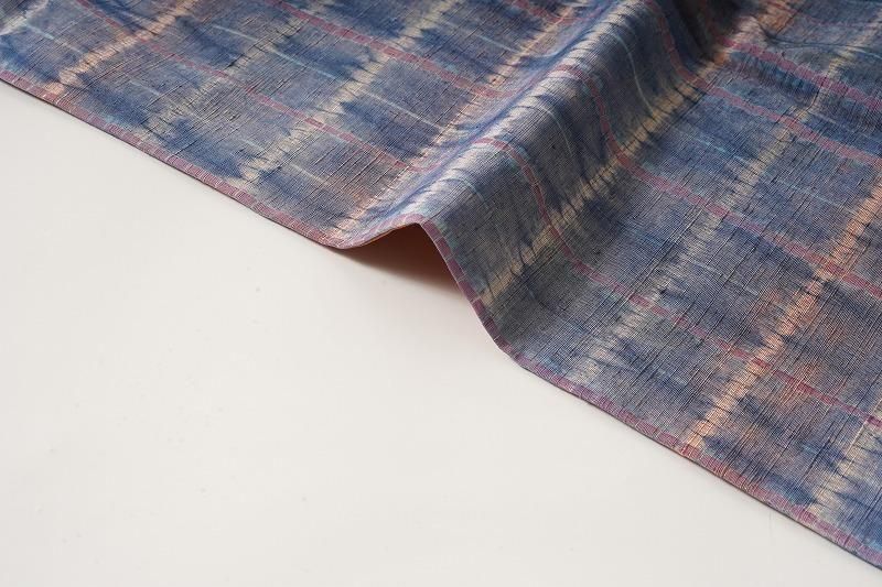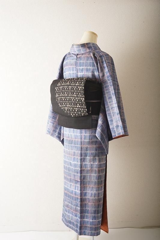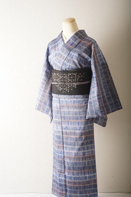 ■特記:深い青紫系の杜若色(和色大辞典参照)が印象的な絞り染めの小紋。差し色のピンクが明るい雰囲気を加え、軽やかな着姿に。