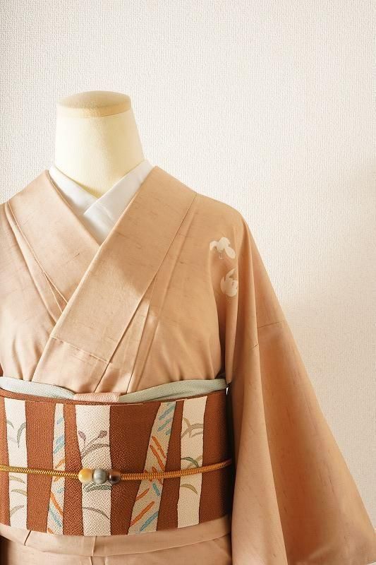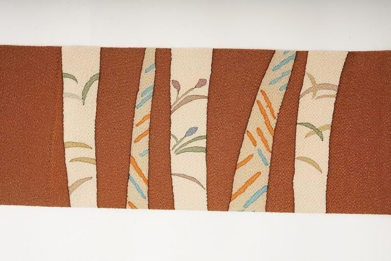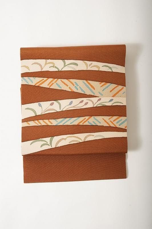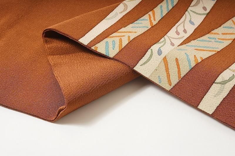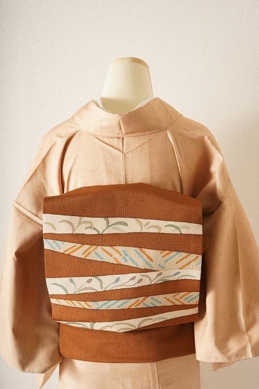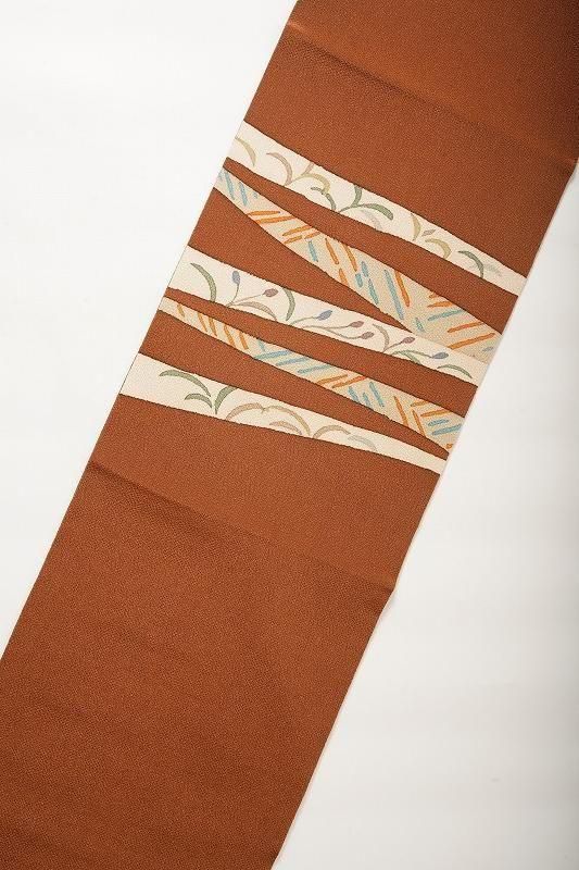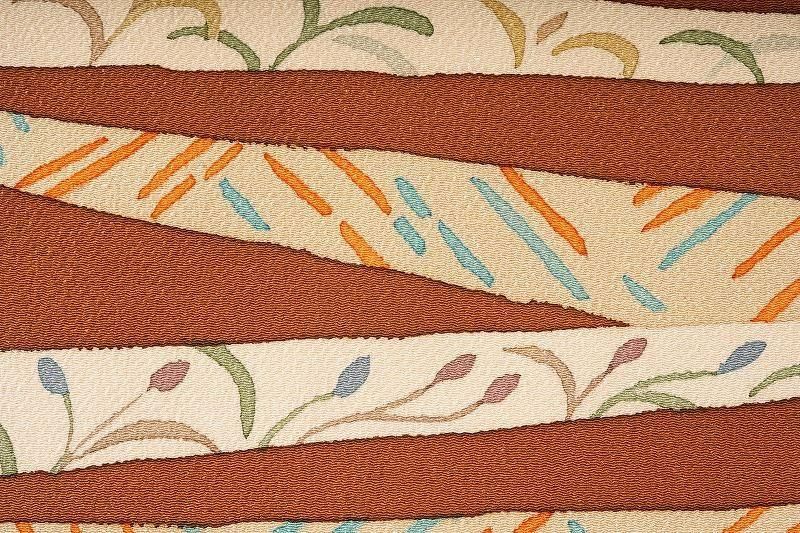 ■特記:やや黄味がかった茶系の土色(和色大辞典参照)のちりめん地。リボンのような段模様に、葉をモチーフにした型染めが抜け感を添えてカラフルに彩ります。