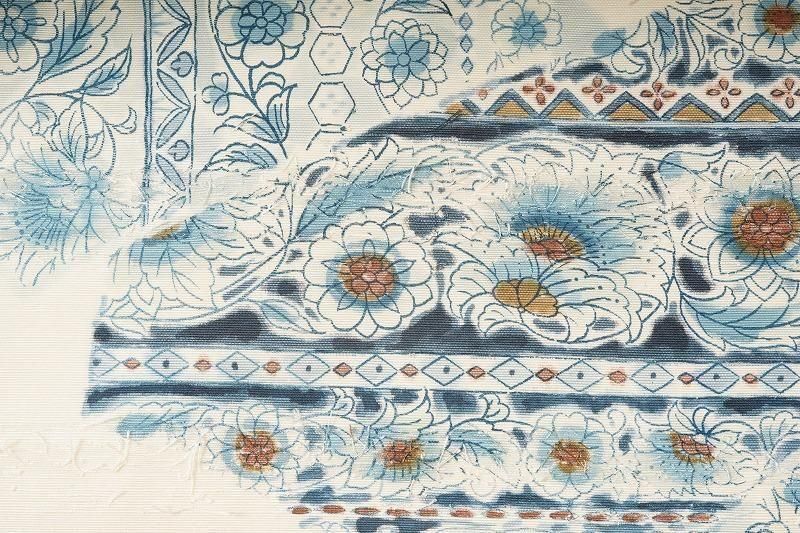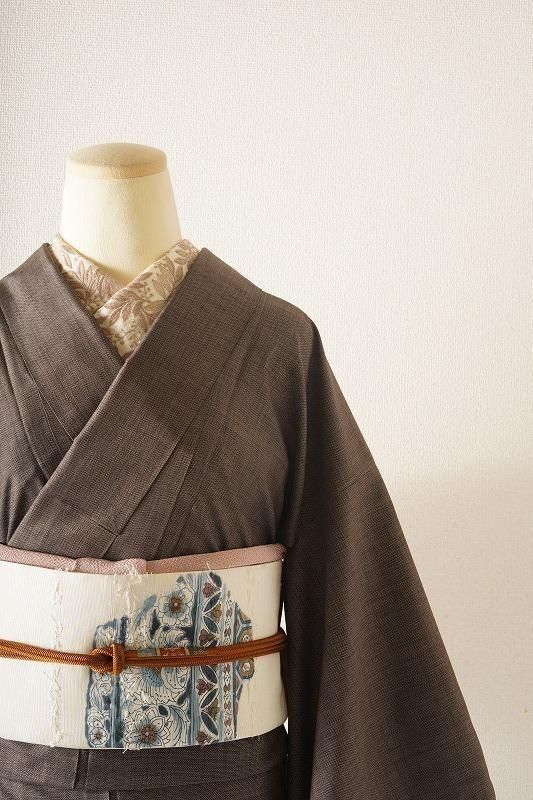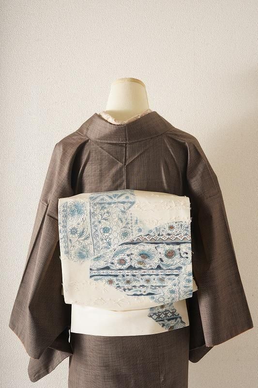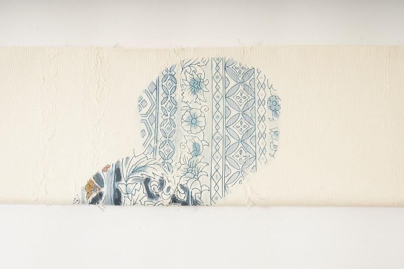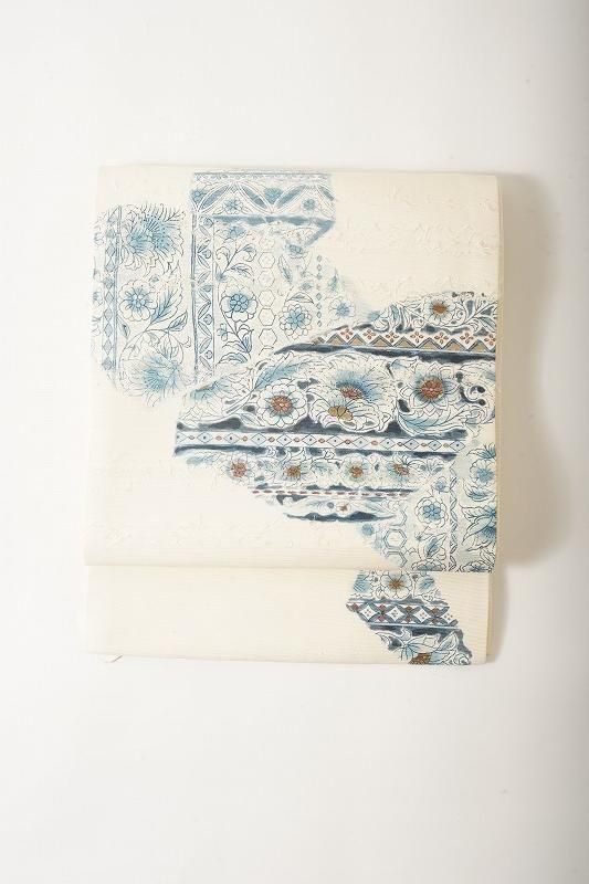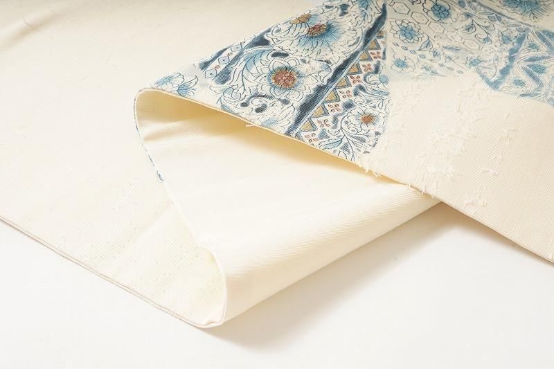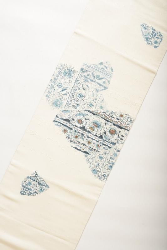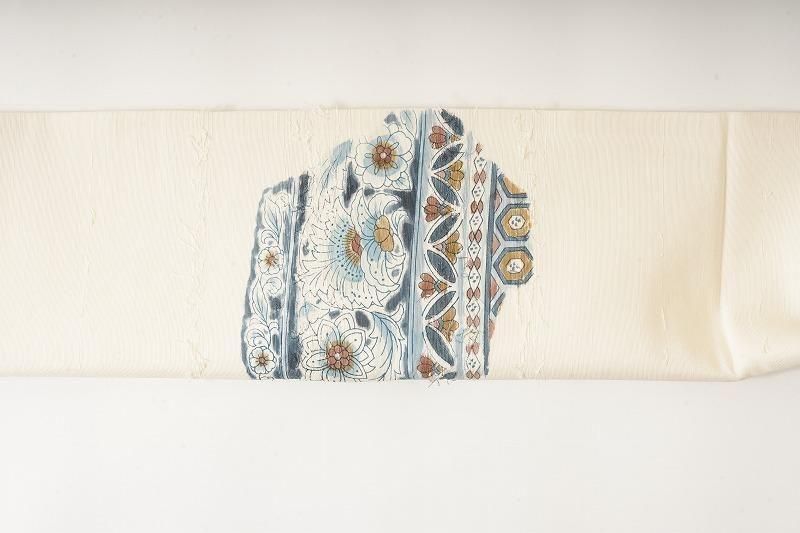 ■特記:クリーム色の優しい地に、ブルーの更紗柄を染めあしらった名古屋帯。髭紬の素朴な風合いに寄り添う清楚な色柄です。