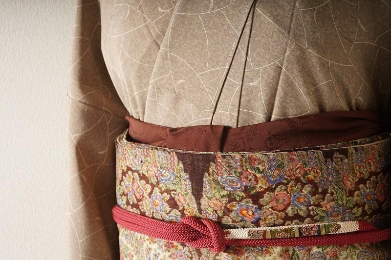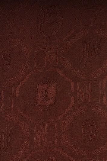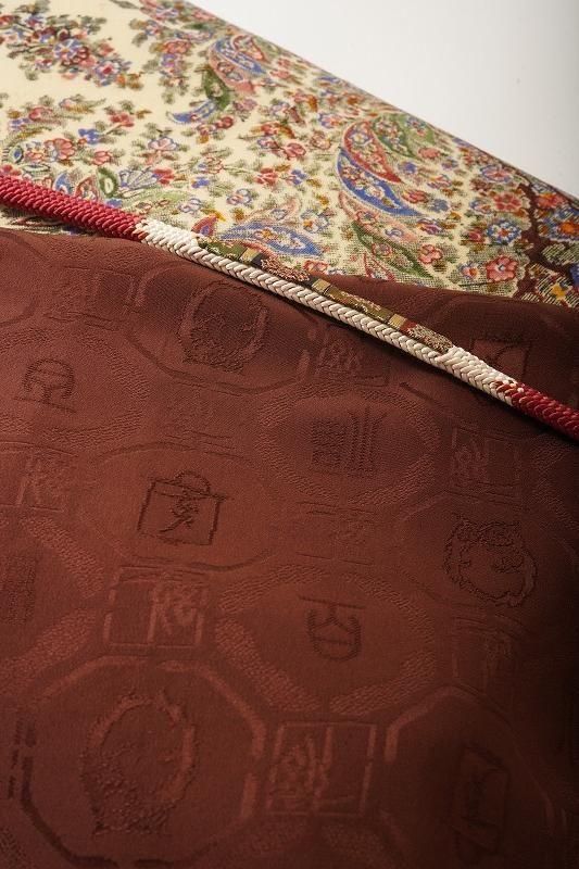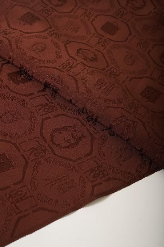 ■特記:お色味はチョコレート色寄りの茶色。蜀江文で梟や文字文の地紋があしらわれた紋意匠丹後ちりめんです。