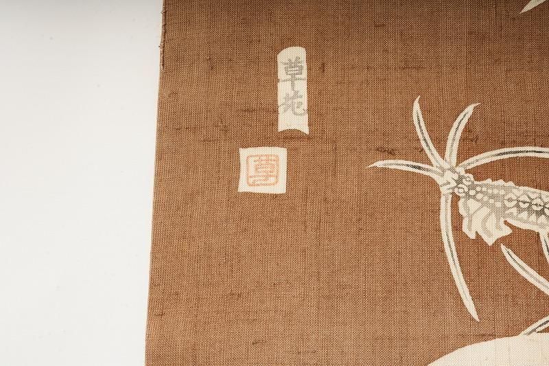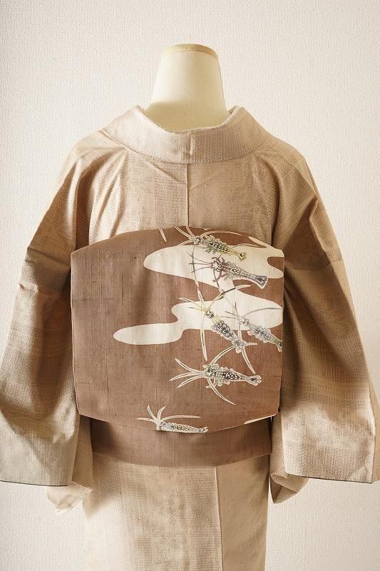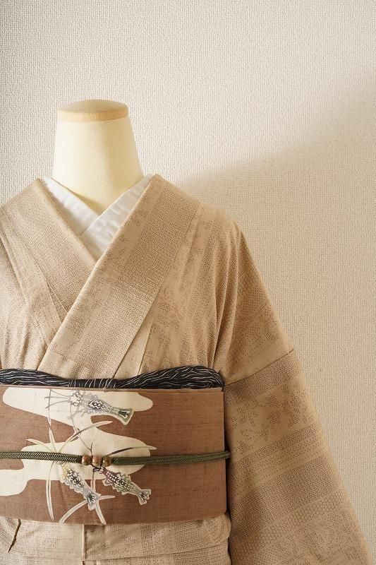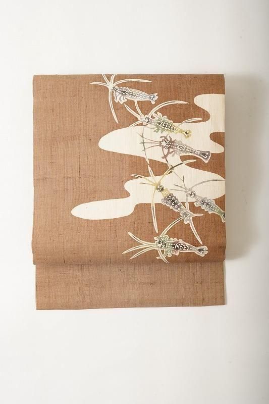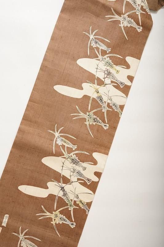 ■特記:松煙染めの第一人者として知られる川島草苑の型絵染め名古屋帯。 柔らかな茶系の香染色(和色大辞典参照)に染め抜かれた海老模様は、長寿や成長を願う吉祥文。穏やかな彩りで趣のある一本です。