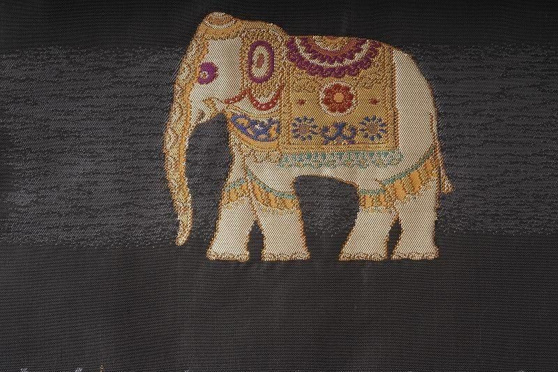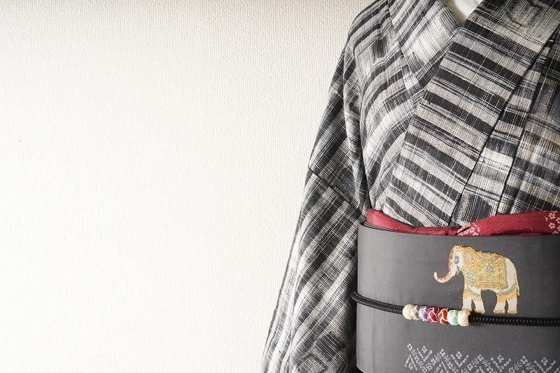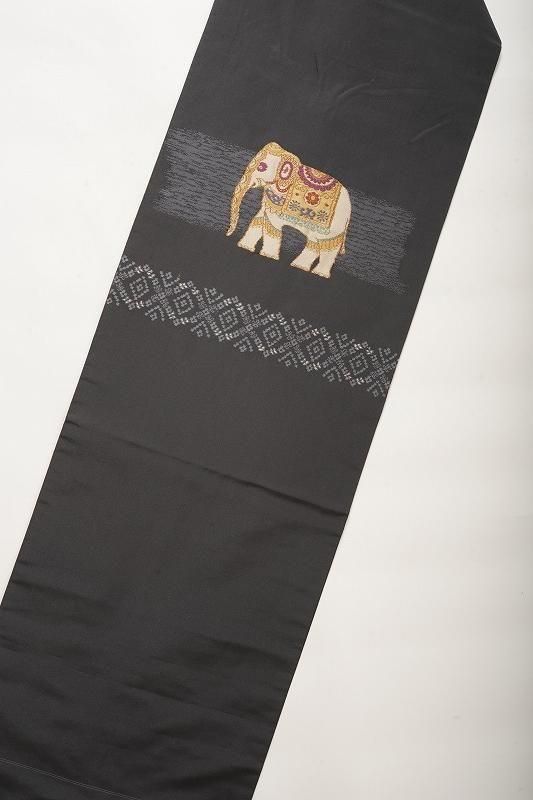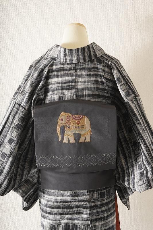 ■特記:深い青が印象的な印度藍色に、切り嵌め風に象をあしらった名古屋帯。優雅に歩く象が、ゆったりとした気品を漂わせます。ノルディック調のライン柄もハイセンスなアクセントに。