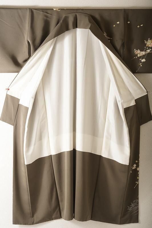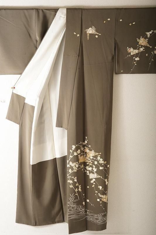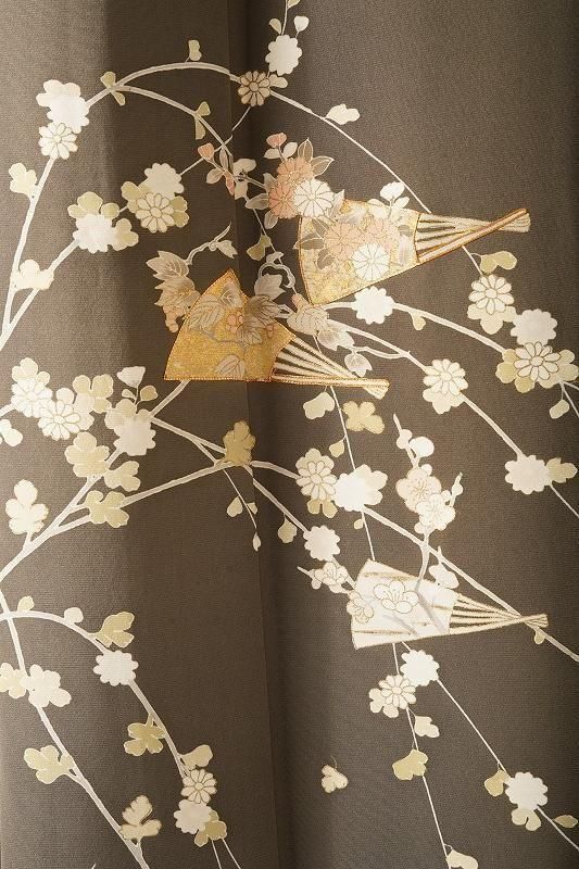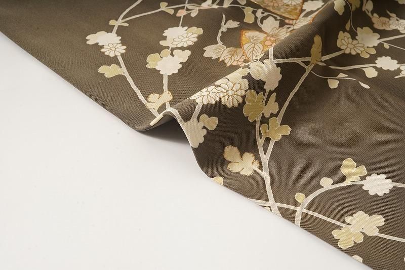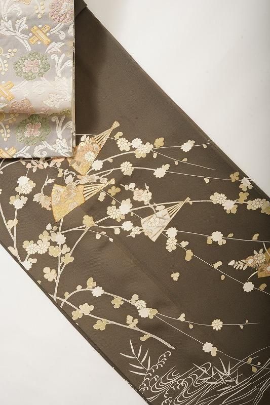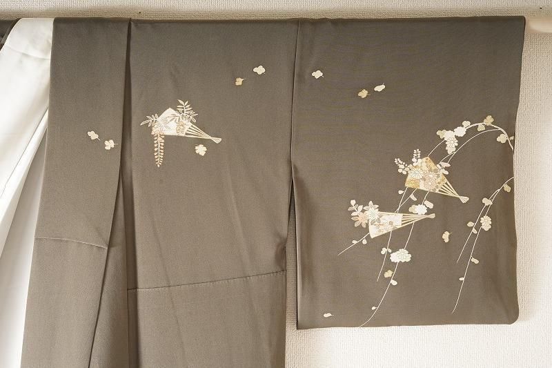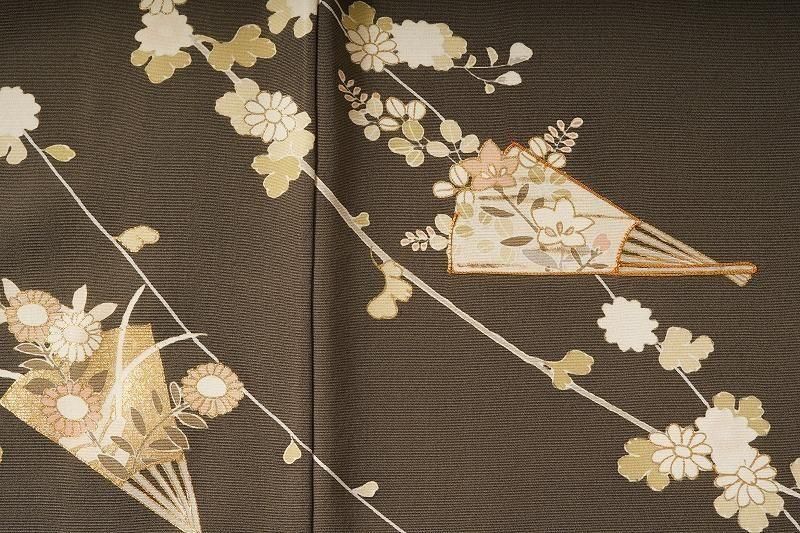 ■特記:海松色(和色大辞典参照)の色味モダンな地。扇、四季草花、風景文が、金彩、金駒の施しを添えて染め表されています。四季の情緒を醸しながら、吉兆扇の華やぎが凪ぐ付け下げです。