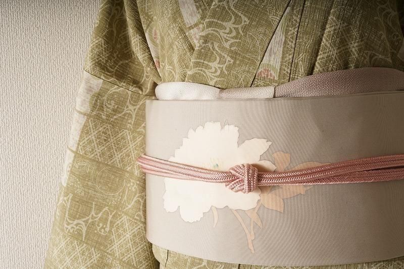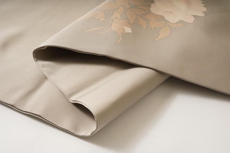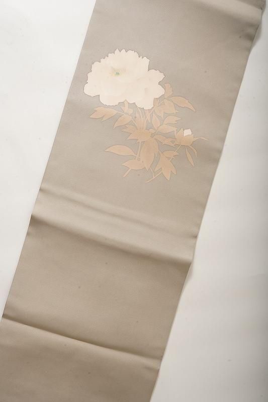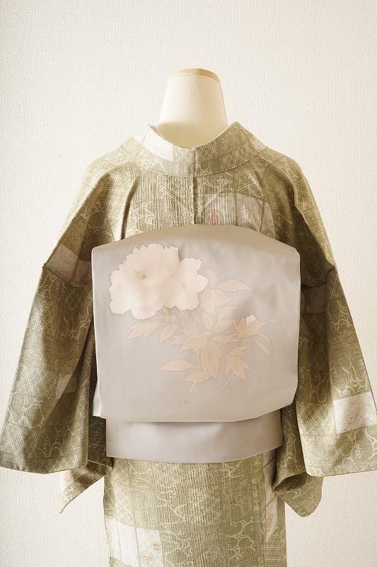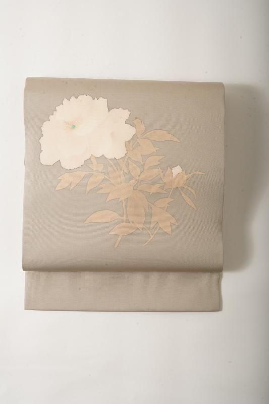 ■特記:霞色の塩瀬地に、おおらかに花咲く牡丹が染め描かれた名古屋帯。紺碧色の雌しべと金彩の雄しべ、ほのかに色づく薄桃色の花弁が、奥ゆかしい品の良さを漂わせます。