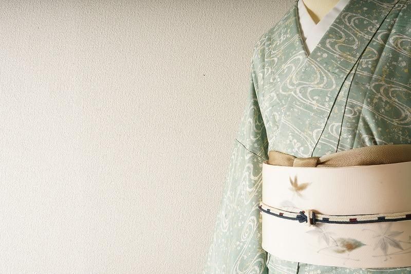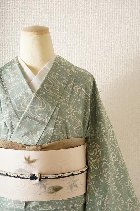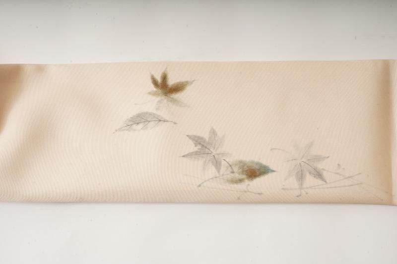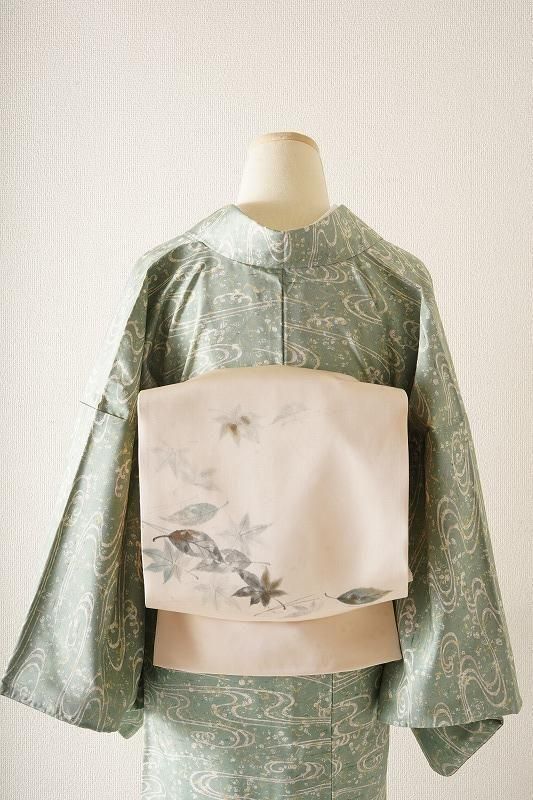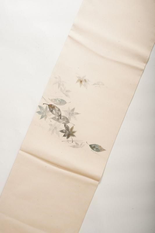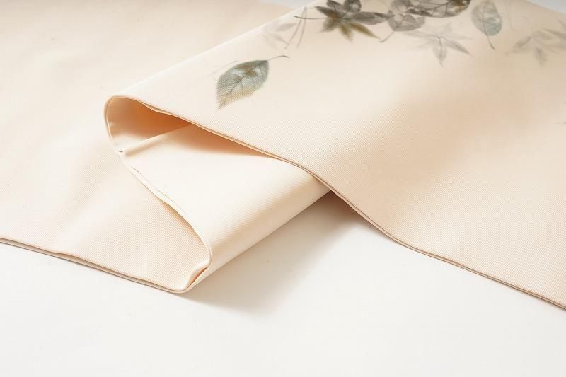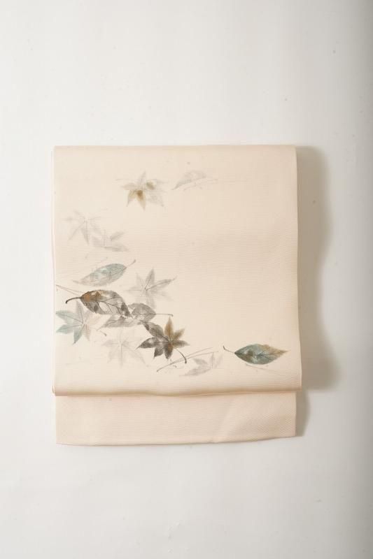 ■特記:アイボリーホワイトの塩瀬地に、手描きで吹き寄せを描いた名古屋帯。薄墨色からわずかに色味を加えた木の葉が抒情的な一面をのぞかせます。