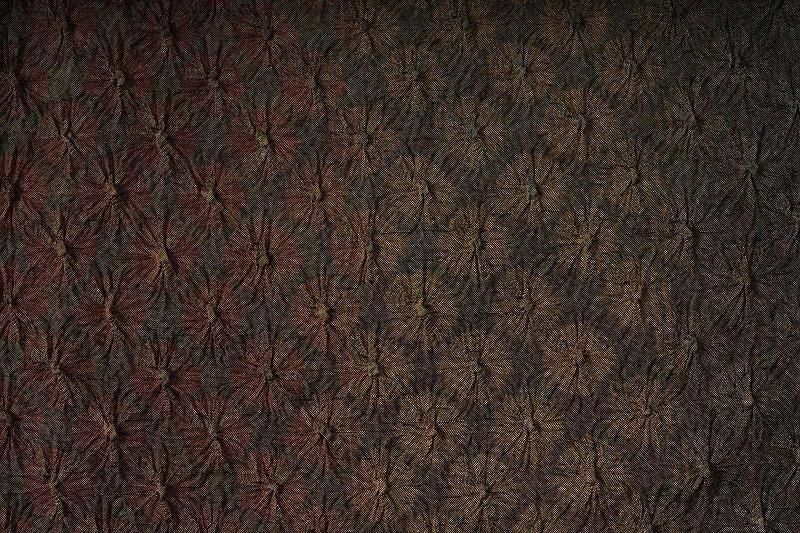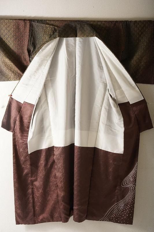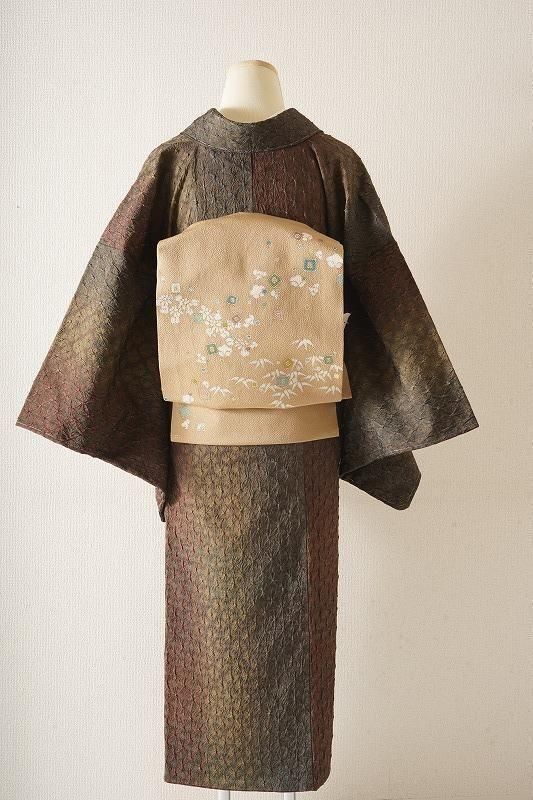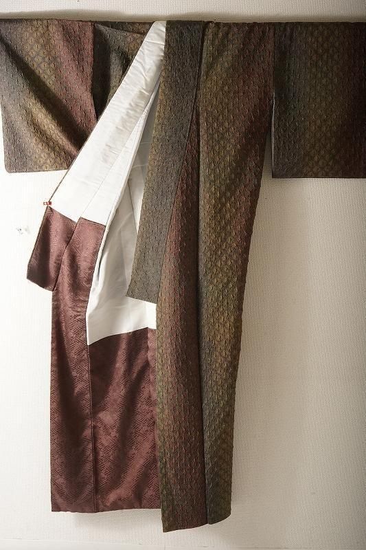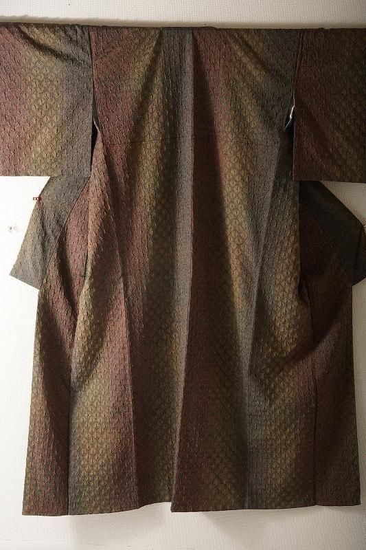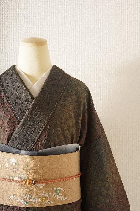 ■特記:八掛にも絞りが施された、総絞りの小紋。茶褐色から仙斎茶色(和色大辞典参照)に移るこっくりとした染め色は、深く色づく秋の気配を感じさせます。