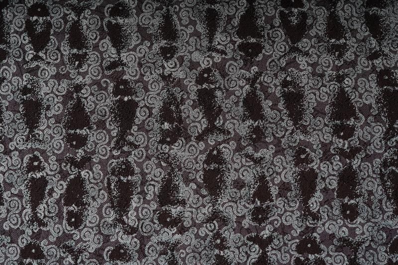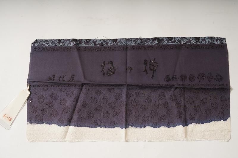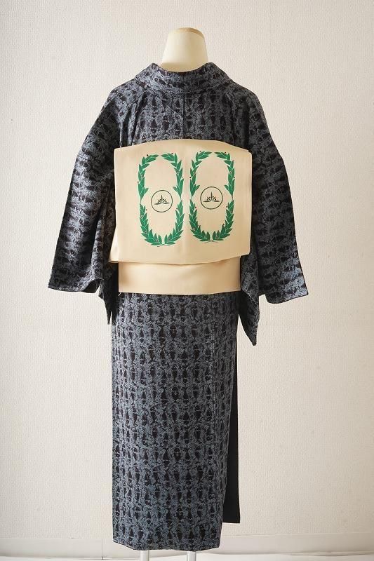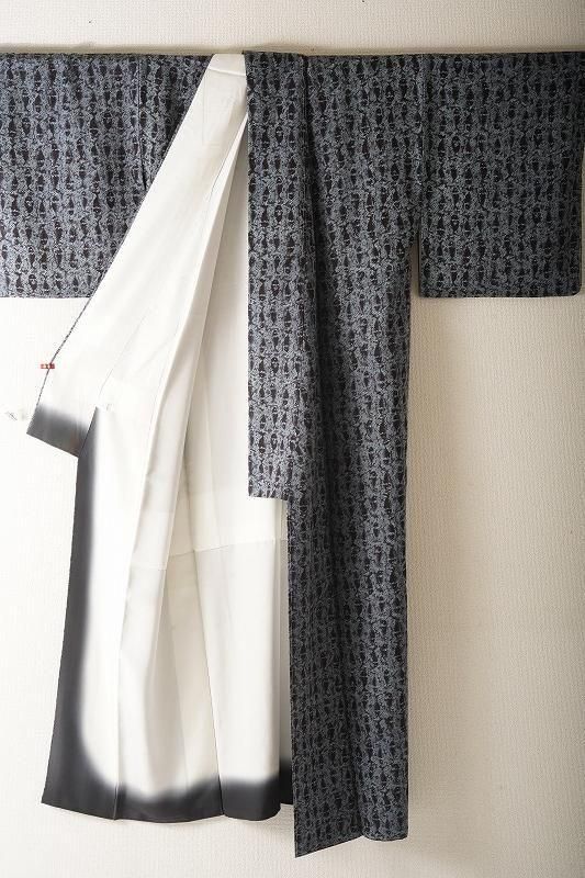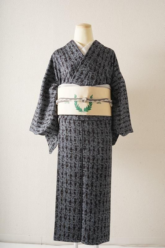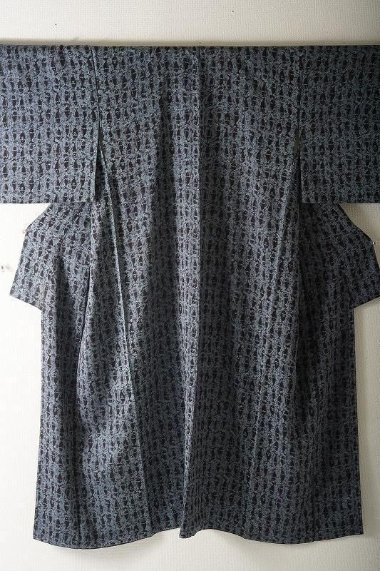地模様のある青褐色地。唐草模様と魚模様を縦に染め抜いた、粋な個性を放つ柄行きです。