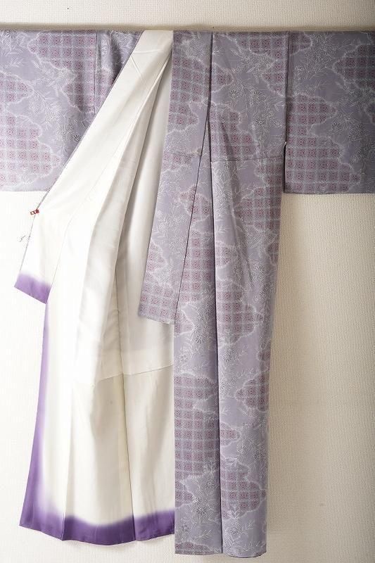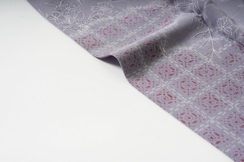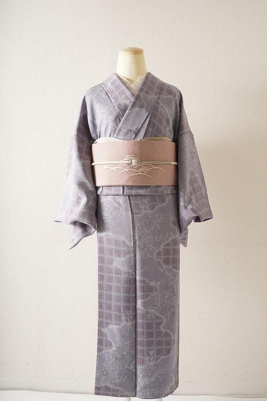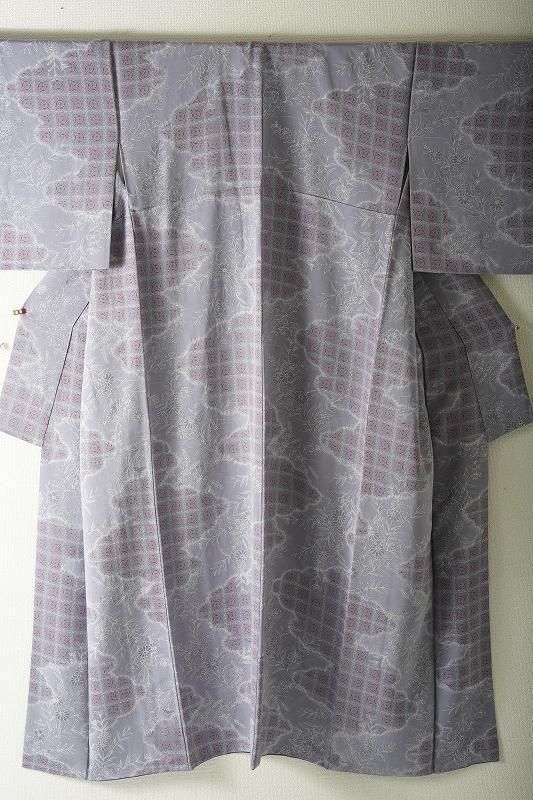 ■特記:くすみ紫色の地は、和色大辞典の『薄鼠色』が近いお色味。地紋起こしされた染め、絞りを丁寧に施した、雲取り四季草花の小紋です。