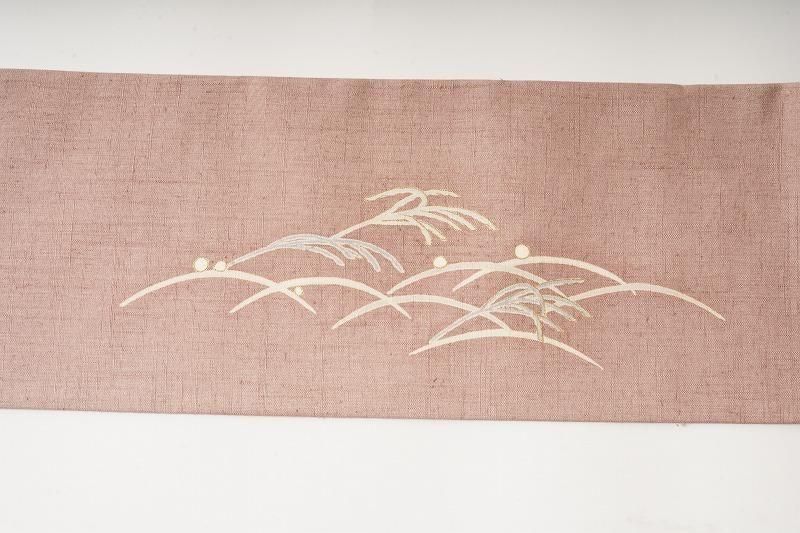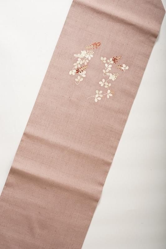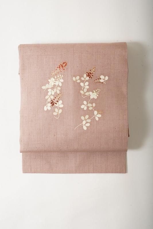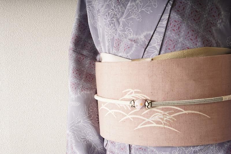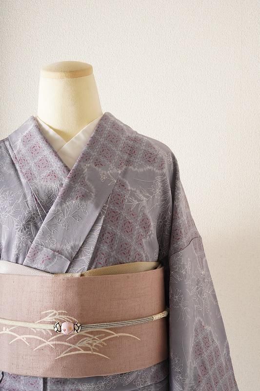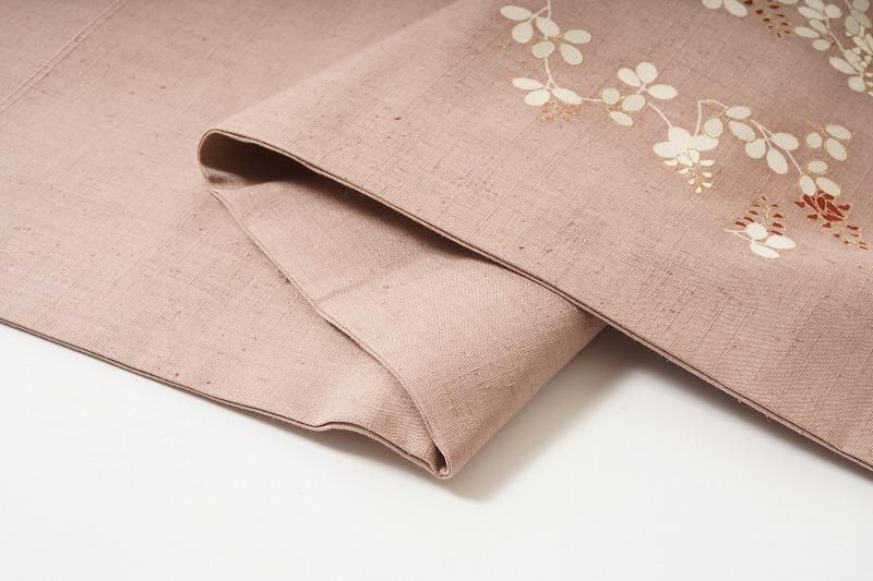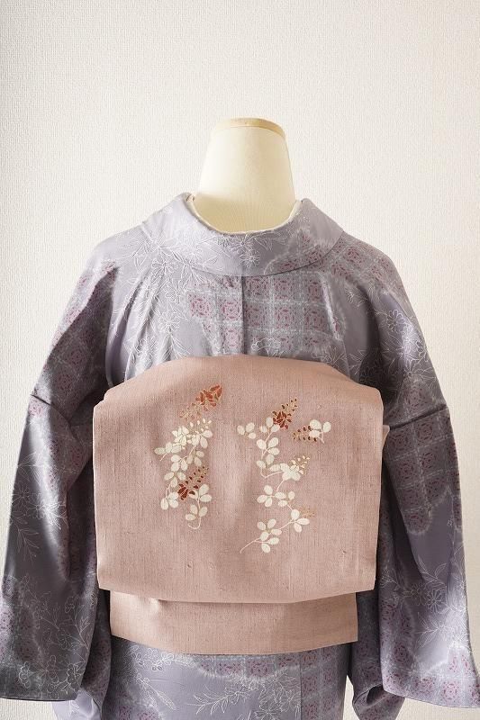 ■特記:くすみピンクの地は、和色大辞典の『水柿色』が近いお色味。お太鼓には金彩入りの萩模様、胴前柄は金彩入りの露芝があしらわれています。