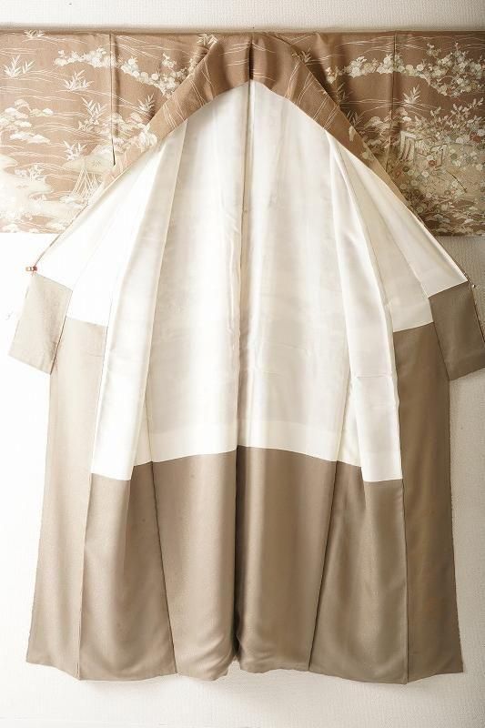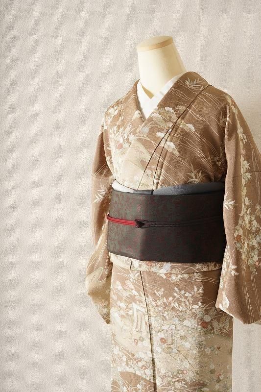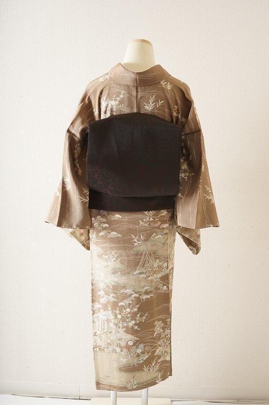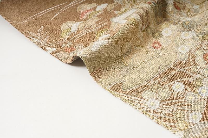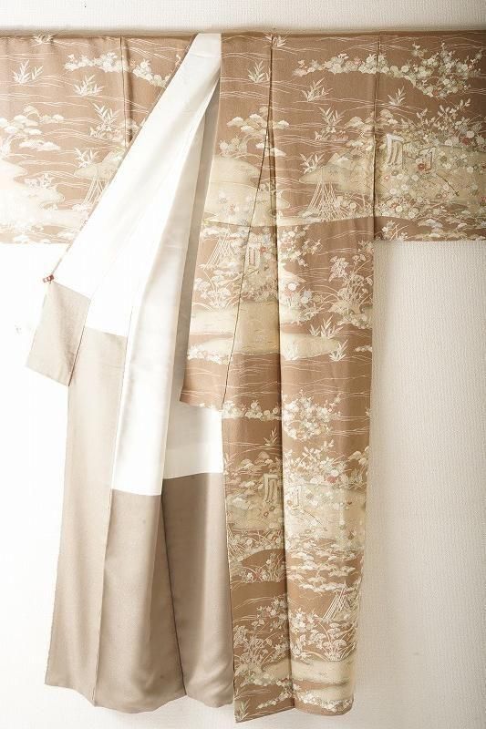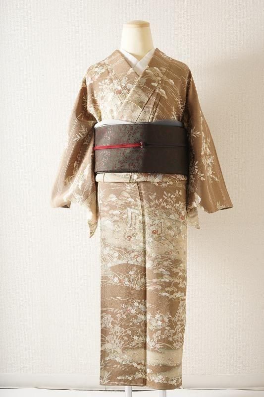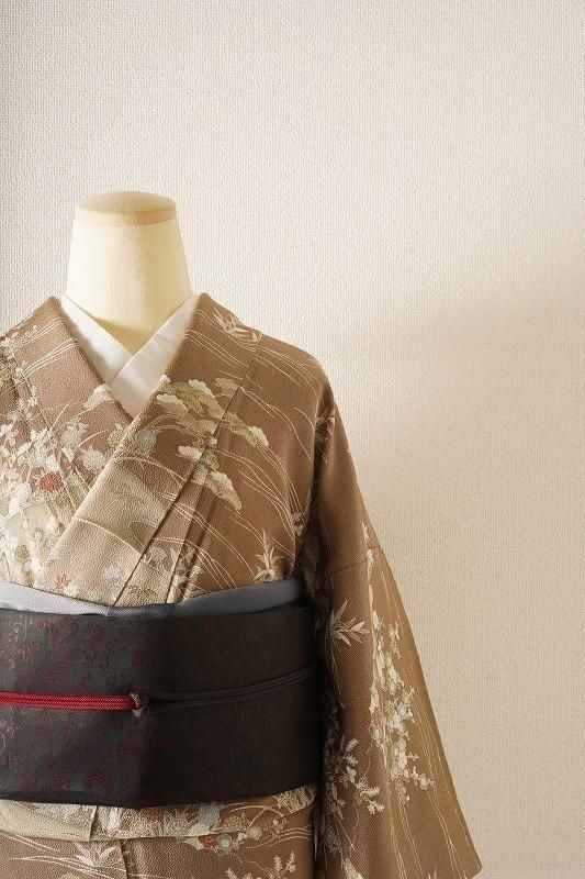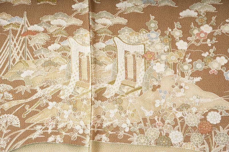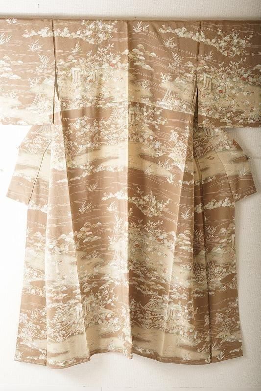 ■特記:四季折々の植物や風景を染め上げた、ちりめん地の訪問着。雅な御所車が四季折々の植物を添えて表現されています。色味は黄茶系の路考茶色(和色大辞典参照)をご参照ください。
