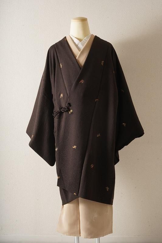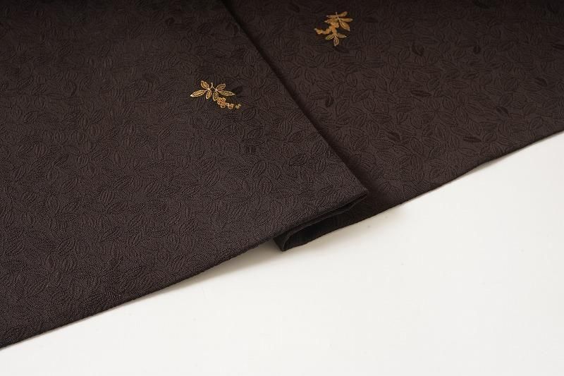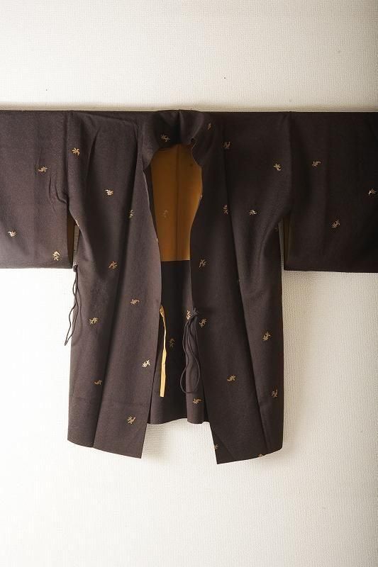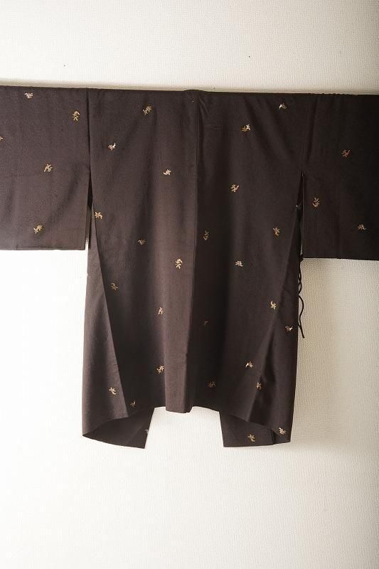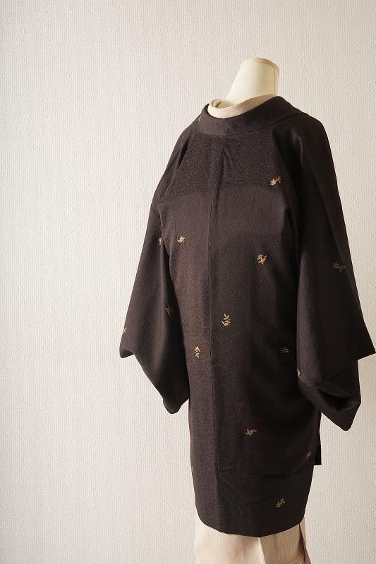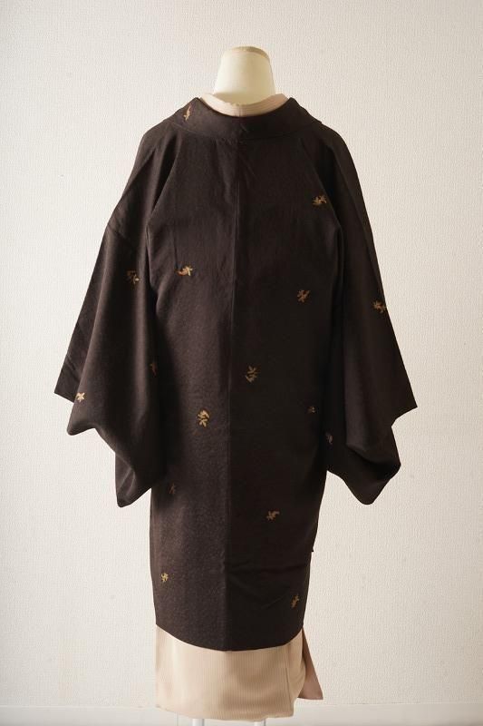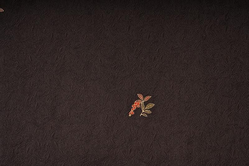 ■特記:濃い紫色がエレガントな道中着。地模様には小さな葉模様が尽くされています。金彩の縁取りを施した小ぶりな実模様を飛び柄に散らした柄行きで、柔和な気品が漂います。