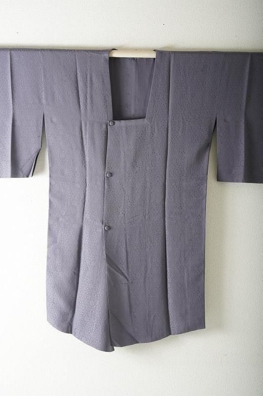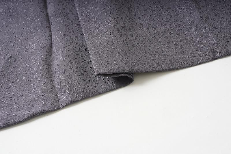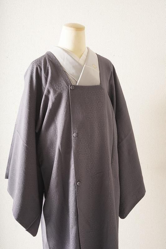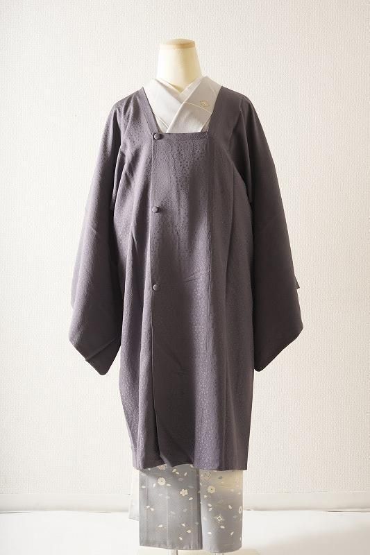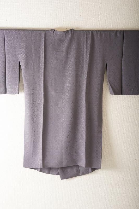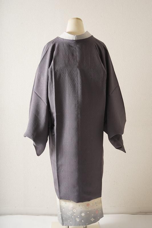 ■特記:雪花の地模様が入った葡萄鼠色の道行コート。光の増減でちらちらと雪花が躍る、柔和な地紋を織り出した色無地のコート、冬のお茶会の必須アイテムです。