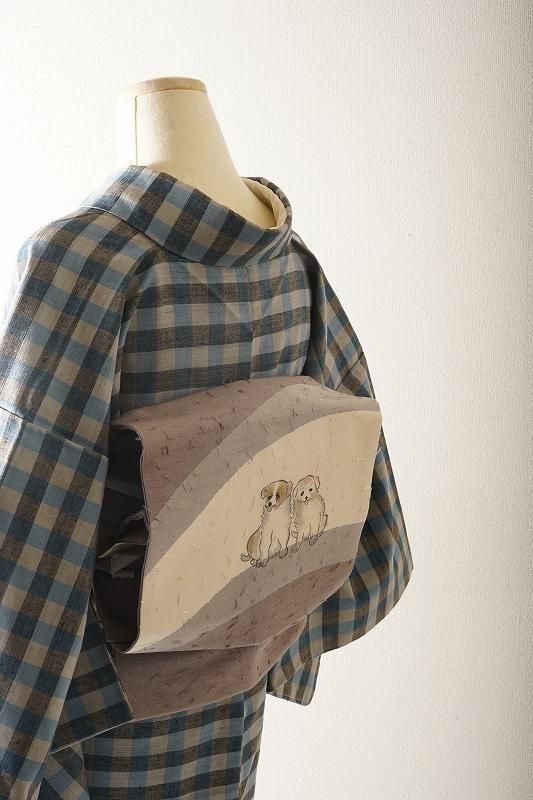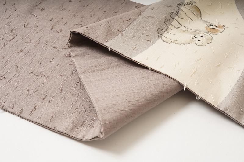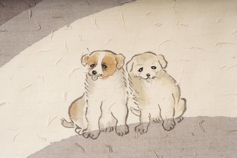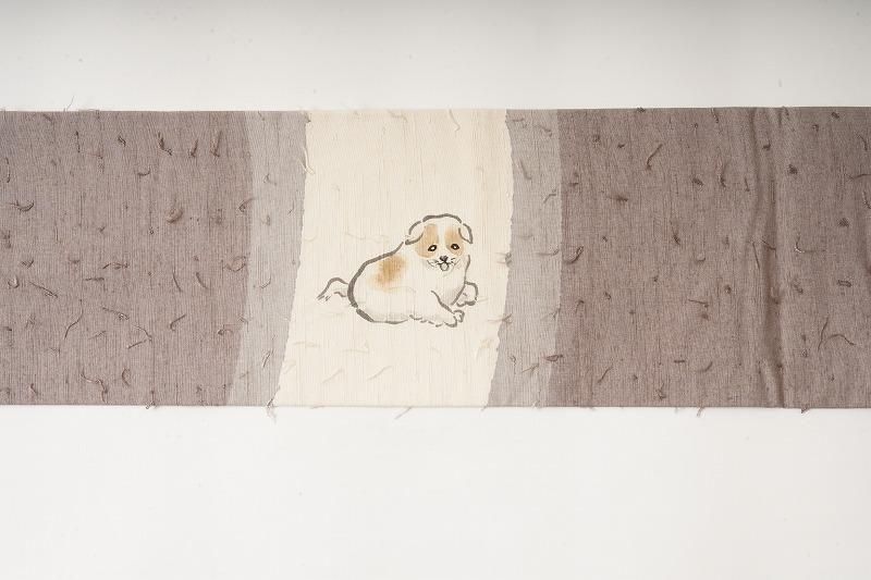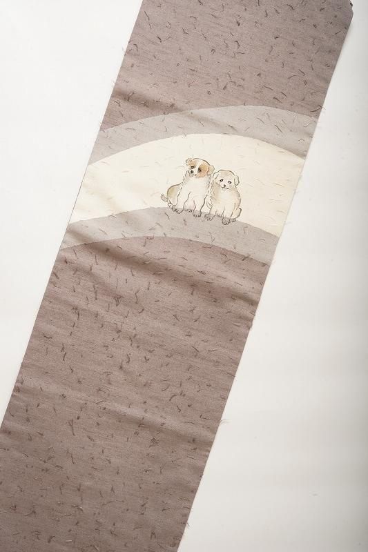 ■特記:樺茶色(和色大辞典参照)から生成り色に移る詫び色トーンが洒落感を表わす髭紬の名古屋帯。思わず目が奪われてしまう愛らしい仔犬たちが染め描かれています。