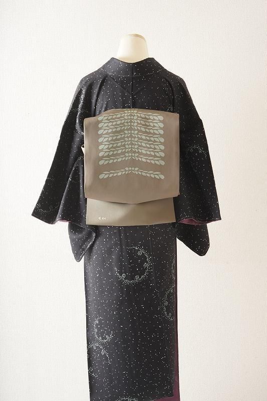 紗綾形地紋の黒地。粒模様を散らし、儚げで幻想的な破れ雪輪を配した小紋です。